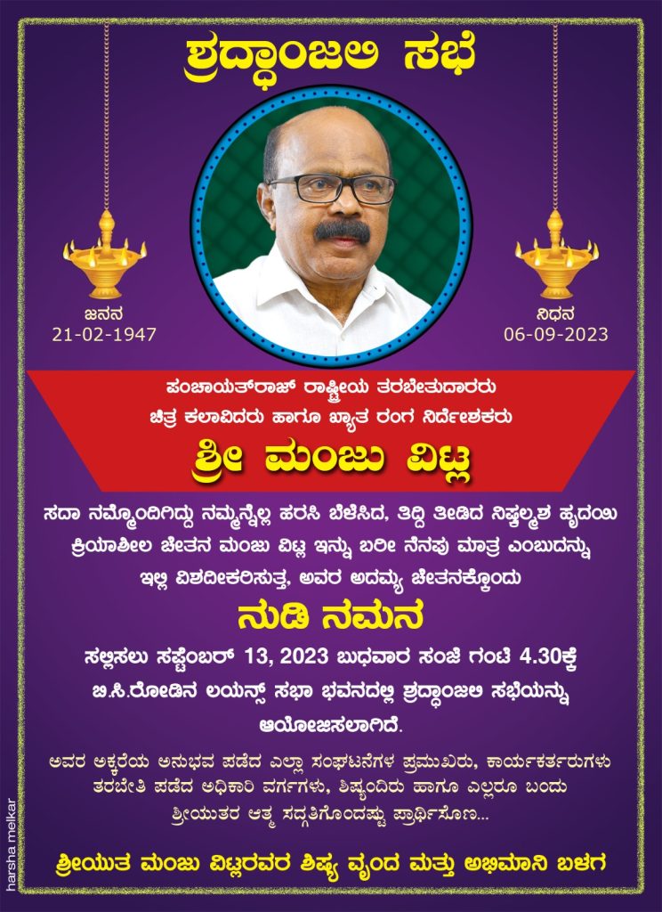 ಇತ್ತೀಚೆಗೆ ನಿಧನರಾದ ಹಿರಿಯ ರಂಗಕರ್ಮಿ, ಪಂಚಾಯತ್ ರಾಜ್ ರಾಜ್ಯ ತರಬೇತುದಾರ ಮಂಜು ವಿಟ್ಲ ಅವರ ಶಿಷ್ಯವೃಂದ ಹಾಗೂ ಅಭಿಮಾನಿ ಬಳಗದ ವತಿಯಿಂದ ಶ್ರದ್ದಾಂಜಲಿ ಸಭೆ ಸೆ.13ರಂದು ಬುಧವಾರ ಸಂಜೆ 4.30ಕ್ಕೆ ಬಿ.ಸಿ.ರೋಡಿನ ಲಯನ್ಸ್ ಸೇವಾ ಮಂದಿರದಲ್ಲಿ ನಡೆಯಲಿದೆ. ಸಾಮಾಜಿಕ, ಧಾರ್ಮಿಕ, ರಾಜಕೀಯ, ಸೇರಿದಂತೆ ವಿವಿಧ ಸಂಘಟನೆಗಳ ಪ್ರಮುಖರು, ಕಾರ್ಯಕರ್ತರು, ತರಬೇತಿ ಪಡೆದ ಅಧಿಕಾರಿ ವರ್ಗ, ಶಿಷ್ಯಂದಿರು ಸಂತಾಪ ಸೂಚಕ ಸಭೆಯಲ್ಲಿ ಭಾಗವಹಿಸಿ ನುಡಿನಮನ ಸಲ್ಲಿಸುವಂತೆ ಪ್ರಕಟಣೆ ತಿಳಿಸಿದೆ.