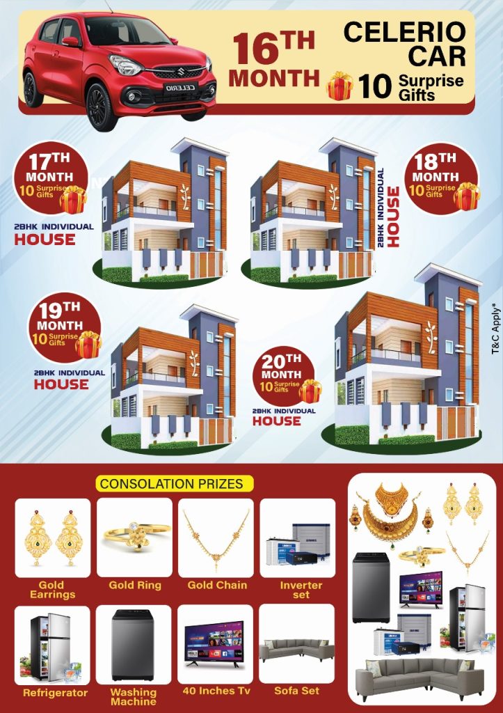 ಬ್ರೈಟ್ ಭಾರತ್ನ ಮೊದಲ ಡ್ರಾ ನವೆಂಬರ್ ತಿಂಗಳಲ್ಲಿ ನಡೆಯಲಿದ್ದು, ಮೊದಲ ತಿಂಗಳಲ್ಲೇ ಮೂರು ಅದೃಷ್ಟಶಾಲಿಗಳಿಗೆ ಆಕ್ಟೀವಾ ಗೆಲ್ಲುವ ಅವಕಾಶವಿದೆ. ಜೊತೆಗೆ ಪ್ರತಿ ತಿಂಗಳು ಕೂಡ ಬೈಕು, ಆಕ್ಟೀವಾ, ಚಿನ್ನ, ಡೈಮಂಡ್, ನಗದು ಬಹುಮಾನವಿದ್ದು, ಹದಿನಾರನೇ ತಿಂಗಳಿನಲ್ಲಿ ಕಾರು ಗೆಲ್ಲುವ ಅವಕಾಶವಿದೆ. ಜೊತೆಗೆ 17-18-19-20 ಈ ನಾಲ್ಕು ತಿಂಗಳಿನಲ್ಲಿ ನಾಲ್ಕು ಸುಸಜ್ಜಿತ ಮನೆ ಗೆಲ್ಲುವ ಅವಕಾಶವನ್ನು ಬ್ರೈಟ್ ಭಾರತ್ ನೀಡಿದ್ದು, ಅದೃಷ್ಟವಂತರು ಎರಡು ಬೆಡ್ರೂಮಿನ ಹೊಸ ಮನೆಯನ್ನು ಹೊಸ ಮನೆಯನ್ನು ತಮ್ಮದಾಗಿಸಿಕೊಳ್ಳಲಿದ್ದಾರೆ.
