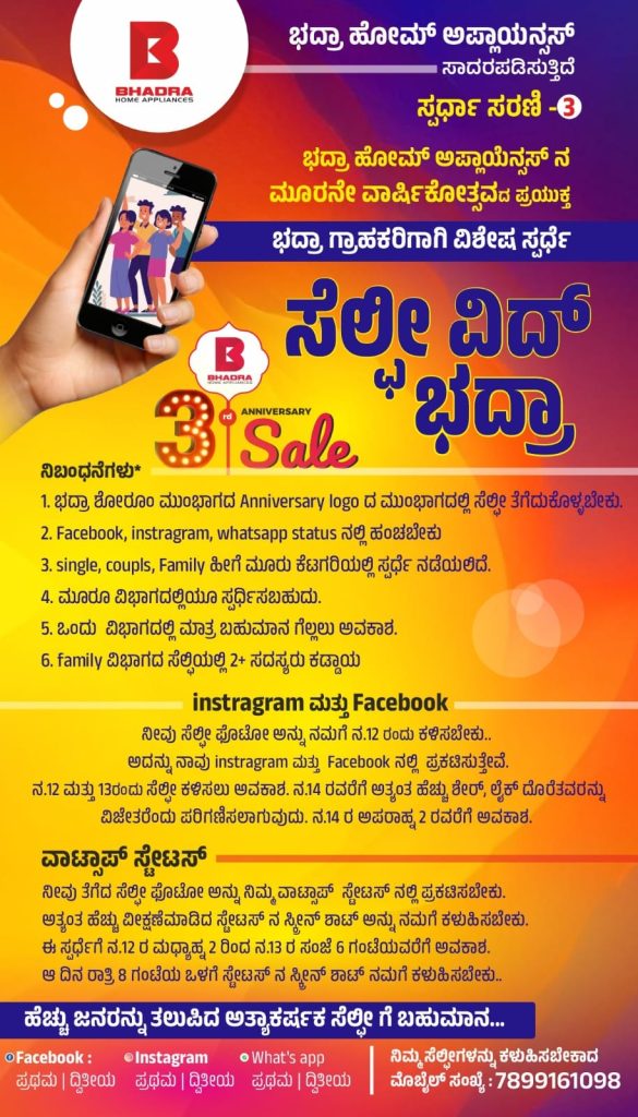 - ಭದ್ರಾ ಶೋರೂಮ್ ಮುಂಭಾಗದ Anniversary logoದ ಮುಂಭಾಗ ಸೆಲ್ಫೀ ತೆಗೆದುಕೊಳ್ಳಬೇಕು.