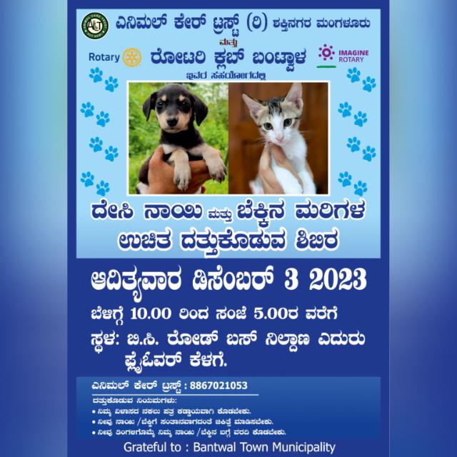 ಬಂಟ್ವಾಳ ರೋಟರಿ ಕ್ಲಬ್ ಸಹಕಾರದೊಂದಿಗೆ, ಮಂಗಳೂರಿನ ಎನಿಮಲ್ ಕೇರ್ ಟ್ರಸ್ಟ್ ಸಂಸ್ಥೆ ಡಿಸೆಂಬರ್ 3ರಂದು ಬಿ ಸಿ ರೋಡ್ ನ ಖಾಸಗಿ ಬಸ್ಟ್ ಸ್ಟಾಂಡ್ ಎದುರಿಗೆ, ಫ್ಲೈಓವರ್ ಕೆಳಗೆ ಸಂಪೂರ್ಣವಾಗಿ ಲಸಿಕೆಗಳನ್ನು ಕೊಟ್ಟ ಭಾರತೀಯ ತಳಿಯ ನಾಯಿ ಬೆಕ್ಕುಮರಿಗಳನ್ನು ಉಚಿತವಾಗಿ ದತ್ತು ಕೊಡುತ್ತಿದ್ದಾರೆ. ಮರಿಗಳನ್ನು ದತ್ತು ಪಡೆಯಲು ಅದಾರ ಪತ್ರ ಕಡ್ಡಾಯ. ಬೆಳಿಗ್ಗೆ ಹತ್ತರಿಂದ ಸಂಜೆ ಐದು ಗಂಟೆಯವರೆಗೆ ಈ ಶಿಭಿರವನ್ನು ನಡೆಸಲಾಗುತ್ತಿದೆ. ಹಣ ಕೊಟ್ಟು ಪ್ರಾಣಿಗಳನ್ನು ಪಡೆಯುವ ಬದಲು ನಮ್ಮ ರಕ್ಷಿಸಿದ ದೇಸೀಯ ಪ್ರಾಣಿಗಳಿಗೆ ಬದುಕನ್ನು ಕೊಡಬಹುದು ಎಂದು ಎನಿಮಲ್ ಕೇರ್ ಟ್ರಸ್ಟ್ ಸಂಸ್ಥೆ ಹಾಗೂ ರೋಟರಿ ಕ್ಲಬ್ ಬಂಟ್ವಾಳದ ಪ್ರಕಟಣೆ ತಿಳಿಸಿದೆ.