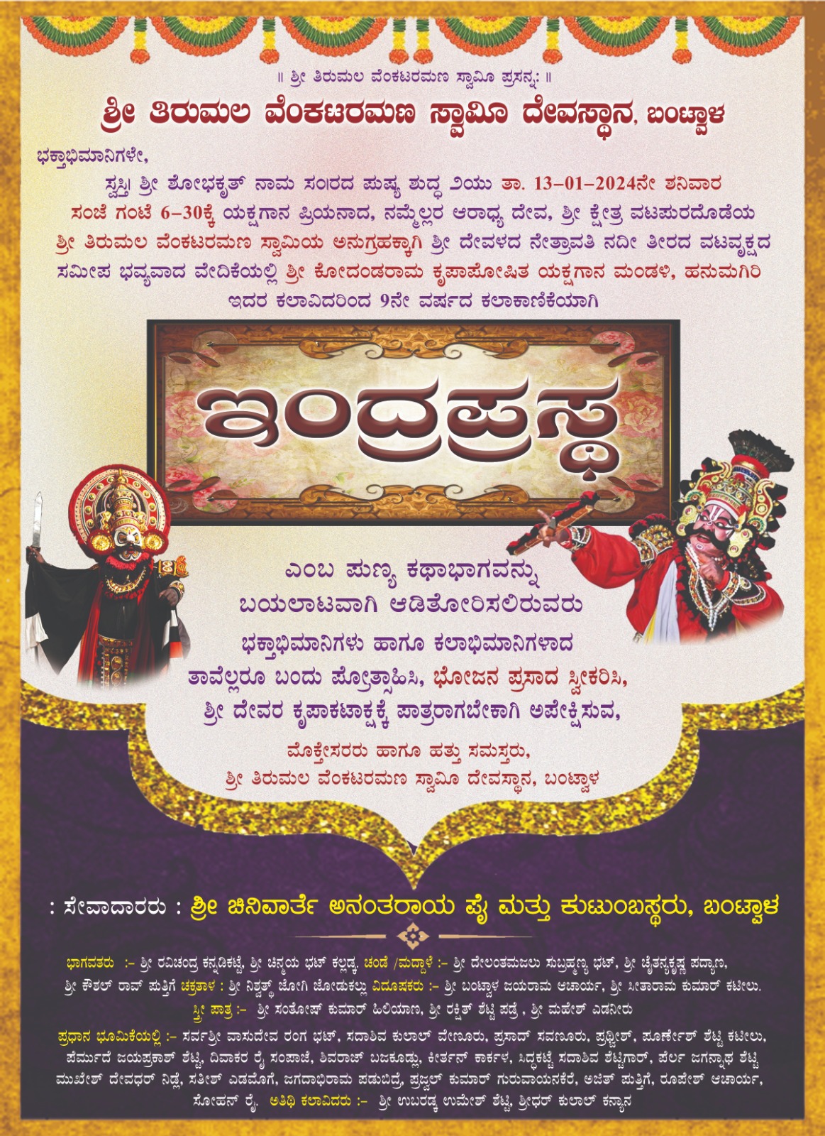 ಚಿನಿವಾರ್ತೆ ಅನಂತರಾಯ ಪೈ ಮತ್ತು ಕುಟುಂಬಸ್ಥರ ವತಿಯಿಂದ ಬಂಟ್ವಾಳದ ಶ್ರೀ ತಿರುಮಲ ವೆಂಕಟರಮಣ ಸ್ವಾಮೀ ದೇವಸ್ಥಾನದಲ್ಲಿ ಶನಿವಾರ ಸಂಜೆ 6.30ಕ್ಕೆ ಯಕ್ಷಗಾನ ಬಯಲಾಟ ನಡೆಯಲಿದೆ. ಶ್ರೀ ದೇವಳದ ನೇತ್ರಾವತಿ ನದಿ ತೀರದ ವಟವೃಕ್ಷದ ಸಮೀಪ ಭವ್ಯವಾದ ವೇದಿಕೆಯಲ್ಲಿ ಶ್ರೀ ಹನುಮಗಿರಿ ಮೇಳದ ಕಲಾವಿದರಿಂದ ಇಂದ್ರಪ್ರಸ್ಥ ಎಂಬ ಕಥಾಭಾಗದ ಯಕ್ಷಗಾನ ಬಯಲಾಟ ನಡೆಯಲಿದೆ ಎಂದು ಮೊಕ್ತೇಸರರು ಹಾಗೂ ಸೇವಾಕರ್ತರು ಪ್ರಕಟಣೆಯಲ್ಲಿ ತಿಳಿಸಿದ್ದಾರೆ.