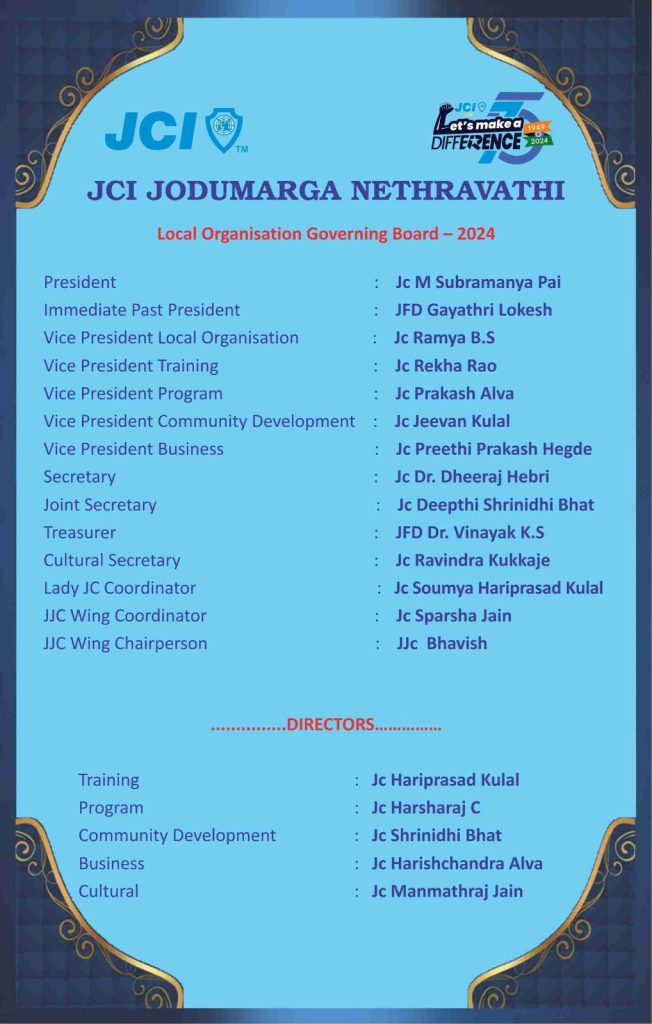 ಪದಾಧಿಕಾರಿಗಳ ಆಯ್ಕೆಯನ್ನು ಘಟಕಾಧಿಕಾರಿಗಳ ಸಭೆಯಲ್ಲಿ ಮಾಡಲಾಗಿದ್ದು, ಅದರಂತೆ ನಿಕಟಪೂರ್ವ ಅಧ್ಯಕ್ಷರಾಗಿ ಗಾಯತ್ರಿ ಲೋಕೇಶ್, ಉಪಾಧ್ಯಕ್ಷರಾಗಿ ರಮ್ಯಾ ಬಿ.ಎಸ್, ರೇಖಾ ರಾವ್, ಪ್ರಕಾಶ್ ಆಳ್ವ, ಜೀವನ್ ಕುಲಾಲ್, ಪ್ರೀತಿ ಪ್ರಕಾಶ್ ಹೆಗ್ಡೆ, ಕಾರ್ಯದರ್ಶಿಯಾಗಿ ಡಾ. ಧೀರಜ್ ಹೆಬ್ರಿ, ಜತೆಕಾರ್ಯದರ್ಶಿಯಾಗಿ ದೀಪ್ತಿ ಶ್ರೀನಿಧಿ ಭಟ್, ಕೋಶಾಧಿಕಾರಿಯಾಗಿ ಡಾ. ವಿನಾಯಕ ಕೆ.ಎಸ್, ಸಾಂಸ್ಕೃತಿಕ ಕಾರ್ಯದರ್ಶಿಯಾಗಿ ರವೀಂದ್ರ ಕುಕ್ಕಾಜೆ, ಮಹಿಳಾ ಜೇಸಿ ಕೋಅರ್ಡಿನೇಟರ್ ಆಗಿ ಸೌಮ್ಯಾ ಹರಿಪ್ರಸಾದ್ ಕುಲಾಲ್, ಜ್ಯೂನಿಯರ್ ಜೇಸಿ ಕೋಅರ್ಡಿನೇಟರ್ ಆಗಿ ಸ್ಪರ್ಶ ಜೈನ್ ಹಾಗೂ ಜ್ಯೂನಿಯರ್ ಜೇಸಿ ಅಧ್ಯಕ್ಷರಾಗಿ ಭವಿಷ್, ನಿರ್ದೇಶಕರಾಗಿ ಹರಿಪ್ರಸಾದ್ ಕುಲಾಲ್, ಹರ್ಷರಾಜ್ ಸಿ, ಶ್ರೀನಿಧಿ ಭಟ್, ಹರಿಶ್ಚಂದ್ರ ಆಳ್ವ, ಮನ್ಮಥರಾಜ್ ಜೈನ್ ಆಯ್ಕೆಗೊಂಡಿರುವುದಾಗಿ ಅವರು ಪ್ರಕಟಣೆಯಲ್ಲಿ ತಿಳಿಸಿದ್ದಾರೆ.