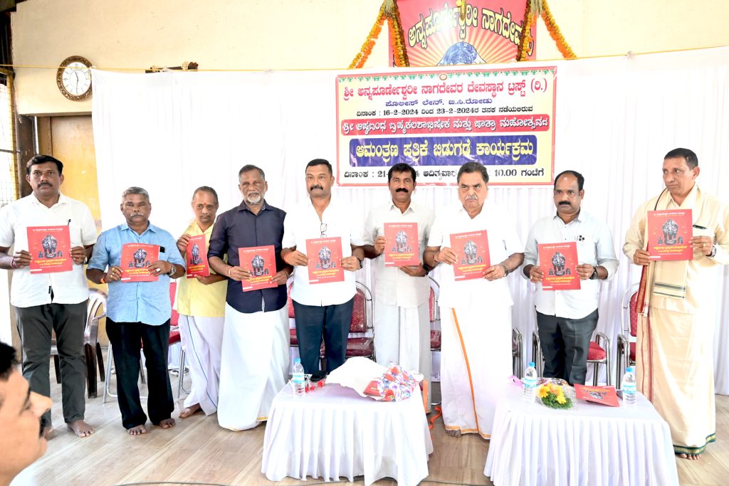 ಶ್ರೀ ಅನ್ನಪೂರ್ಣೇಶ್ವರೀ ನಾಗದೇವರ ದೇವಸ್ಥಾನ ಟ್ರಸ್ಟ್ ವತಿಯಿಂದ ಬಿ.ಸಿ.ರೋಡ್ ನ ಪೊಲೀಸ್ ಲೇನ್ ನಲ್ಲಿರುವ ಕ್ಷೇತ್ರದಲ್ಲಿ ಅಷ್ಟಬಂಧ ಬ್ರಹ್ಮಕಲಶಾಭಿಷೇಕ ಕಾರ್ಯಕ್ರಮ ಮತ್ತು ಜಾತ್ರಾ ಮಹೋತ್ಸವದ ಆಮಂತ್ರಣ ಪತ್ರಿಕೆ ಬಿಡುಗಡೆ ಕಾರ್ಯಕ್ರಮ ಭಾನುವಾರ ನಡೆಯಿತು.