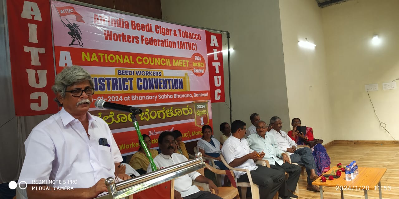ಅಖಿಲ ಭಾರತಟ್ರೇಡ್ ಯೂನಿಯನ್ ಕಾಂಗ್ರೆಸ್ (ಎಐಟಿಯುಸಿ) ರಾಷ್ಟ್ರೀಯ ಮಂಡಳಿ ಸಭೆಯ ಅಂಗವಾಗಿ ಎಸ್. ಕೆ. ಬೀಡಿ ವರ್ಕರ್ಸ್ ಫೆಡರೇಶನ್ ಆಶ್ರಯದಲ್ಲಿ ಬಂಟ್ವಾಳದ ಭಂಡಾರಿ ಸಭಾಭವನದಲ್ಲಿ ನಡೆದ ಬೀಡಿ ಕಾರ್ಮಿಕರ ಜಿಲ್ಲಾ ಸಮಾವೇಶ ಉದ್ಘಾಟಿಸಿ ಮಾತನಾಡಿದರು.
