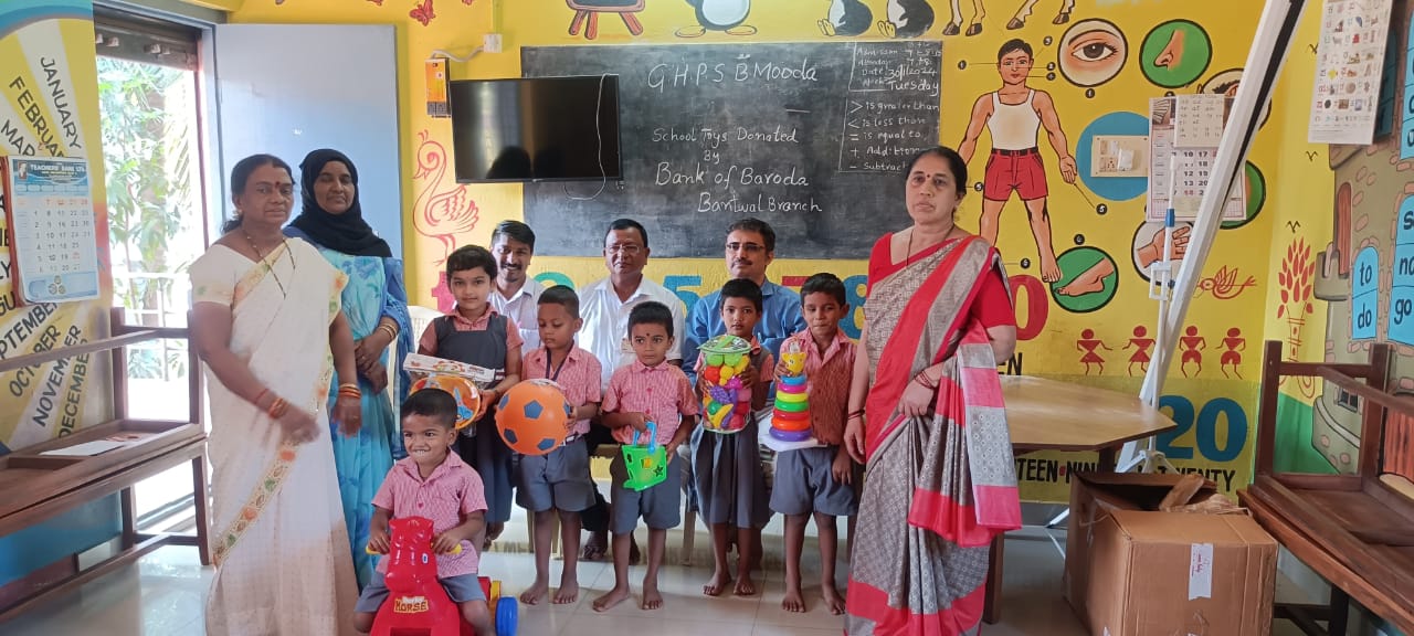 ಬಿ.ಸಿ.ರೋಡಿನ ಅಜ್ಜಿಬೆಟ್ಟಿನಲ್ಲಿರುವ ಬಿ.ಮೂಡ ಸರಕಾರಿ ಹಿರಿಯ ಪ್ರಾಥಮಿಕ ಶಾಲೆಯಲ್ಲಿ ಎಲ್.ಕೆ.ಜಿ ಮತ್ತು ಯು.ಕೆ.ಜಿಯ ವಿದ್ಯಾರ್ಥಿಗಳ ಕಲಿಕೆಗೆ ಪೂರಕವಾಗುವಂತೆ ಬ್ಯಾಂಕ್ ಆಫ್ ಬರೋಡಾದ ಬಂಟ್ವಾಳ ಶಾಖೆ ವತಿಯಿಂದ ಕಲಿಕಾ ಆಟಿಕೆಗಳನ್ನು ಮಂಗಳವಾರ ಹಸ್ತಾಂತರಿಸಲಾಯಿತು. ಬ್ಯಾಂಕಿನ ಅಸಿಸ್ಟೆಂಟ್ ಮ್ಯಾನೇಜರ್ ವಾಮನ್ ನಾಯಕ್ ಮತ್ತು ಸಿಬಂದಿ ಹಾಗೂ ಹಳೆ ವಿದ್ಯಾರ್ಥಿ ಚೇತನ್ ಕುಮಾರ್ ಅವರು ಮುಖ್ಯೋಪಾಧ್ಯಾಯರಾದ ಲಕ್ಷ್ಮೀ ಕೆ. ಅವರಿಗೆ ಹಸ್ತಾಂತರ ಮಾಡಿ ಇದು ಮಕ್ಕಳಿಗೆ ಉಪಯೋಗವಾಗಲಿ ಎಂದು ಶುಭ ಹಾರೈಸಿದರು.ಈ ಸಂದರ್ಭ ಎಸ್.ಡಿ.ಎಂ.ಸಿ. ಅಧ್ಯಕ್ಷ ಹರೀಶ ಮಾಂಬಾಡಿ, ಸಹಶಿಕ್ಷಕರಾದ ತಾಹಿರಾ, ಸುಶೀಲಾ, ಶಿಕ್ಷಕಿಯರಾದ ಪೂರ್ಣಿಮಾ, ಲಾವಣ್ಯ ಉಪಸ್ಥಿತರಿದ್ದರು.