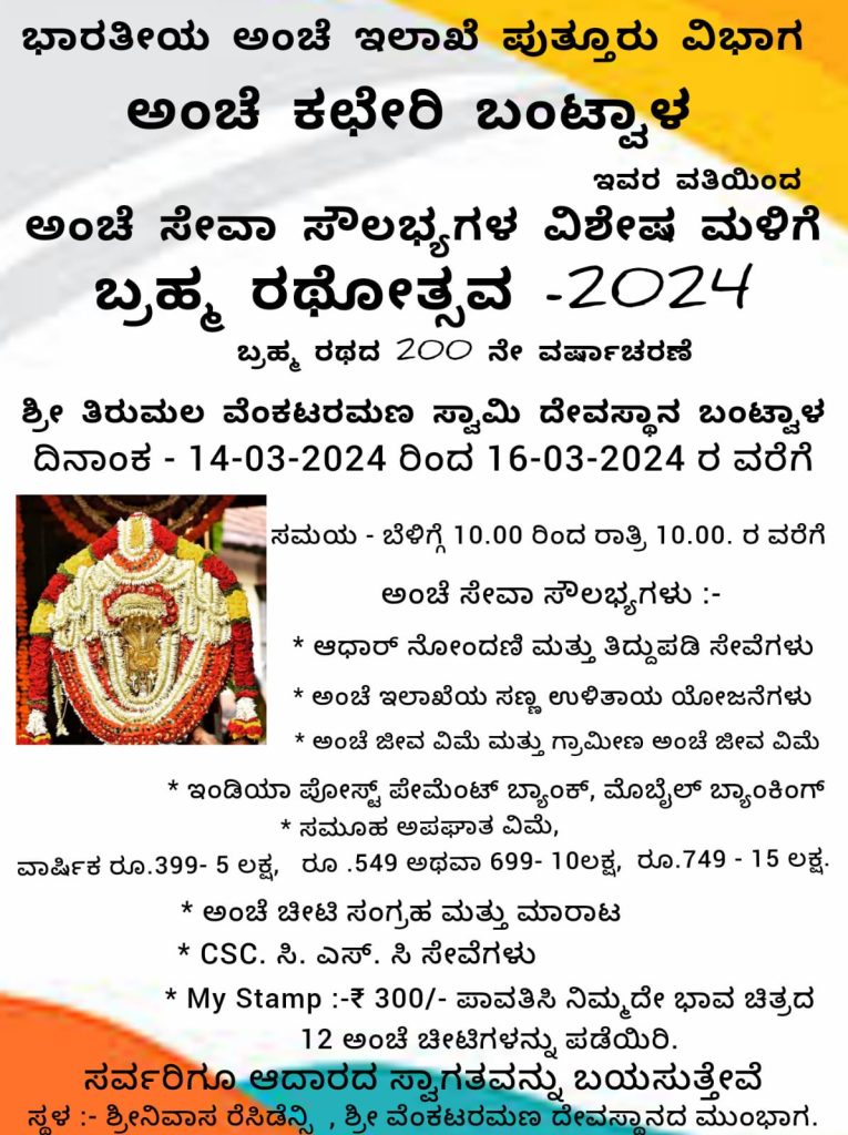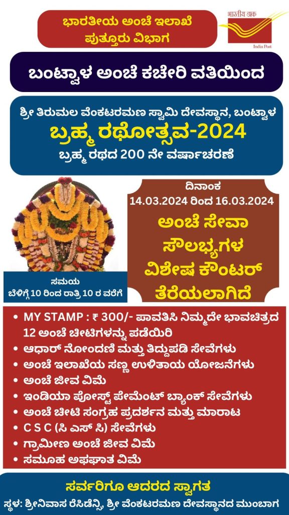 ಬಂಟ್ವಾಳದ ಶ್ರೀ ತಿರುಮಲ ವೆಂಕಟರಮಣ ಸ್ವಾಮೀ ದೇವಸ್ಥಾನದ ಬ್ರಹ್ಮರಥೋತ್ಸವ ಹಿನ್ನೆಲೆಯಲ್ಲಿ ಈಗಾಗಲೇ ಉತ್ಸವಾದಿಗಳು ಆರಂಭಗೊಂಡಿದ್ದು, 16ರಂದು ಬ್ರಹ್ಮರಥೋತ್ಸವ ನಡೆಯಲಿದೆ. ಈ ಹಿನ್ನೆಲೆಯಲ್ಲಿ ಬಂಟ್ವಾಳ ಅಂಚೆ ಕಚೇರಿ ವತಿಯಿಂದ ಅಂಚೆ ಸೇವಾ ಸೌಲಭ್ಯಗಳ ವಿಶೇಷ ಮಳಿಗೆಯನ್ನು ತೆರೆಯಲಾಗಿದ್ದು, ಮಾರ್ಚ್ 14ರಿಂದ 16ರವರೆಗೆ ಇರಲಿದೆ. ಶ್ರೀ ವೆಂಕಟರಮಣ ದೇವಸ್ಥಾನದ ಮುಂಭಾಗ ಶ್ರೀನಿವಾಸ ರೆಸಿಡೆನ್ಸಿಯಲ್ಲಿ ಈ ಮಳಿಗೆ ಬೆಳಗ್ಗೆ 10ರಿಂದ ರಾತ್ರಿ 10ರವರೆಗೆ ಇರಲಿದೆ.