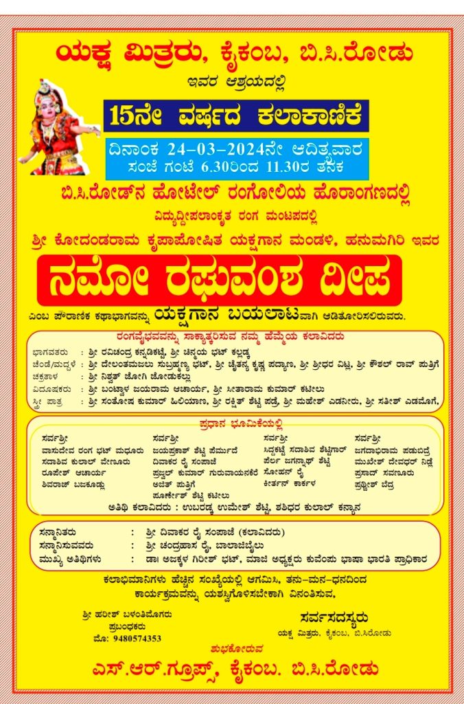 ಬಿ.ಸಿ.ರೋಡ್ ನ ಹೋಟೆಲ್ ರಂಗೋಲಿಯ ಹೊರಾಂಗಣದಲ್ಲಿ ಮಾರ್ಚ್ 23ರಂದು ಸಂಜೆ 6.30ರಿಂದ 11.30ರವರೆಗೆ ಹನುಮಗಿರಿ ಮೇಳದಿಂದ ನಮೋ ರಘುವಂಶ ದೀಪ ಎಂಬ ಯಕ್ಷಗಾನ ಬಯಲಾಟ ನಡೆಯಲಿದೆ. ಯಕ್ಷಮಿತ್ರರು ಕೈಕಂಬ ವತಿಯಿಂದ ಈ ಯಕ್ಷಗಾನ ನಡೆಯಲಿದೆ ಎಂದು ಪ್ರಕಟಣೆ ತಿಳಿಸಿದ್ದು, ಈ ಸಂದರ್ಭ ಕಲಾವಿದ ದಿವಾಕರ ರೈ ಸಂಪಾಜೆ ಅವರನ್ನು ಸನ್ಮಾನಿಸಲಾಗುವುದು. ಕುವೆಂಪು ಭಾಷಾ ಭಾರತಿ ಪ್ರಾಧಿಕಾರದ ಮಾಜಿ ಅಧ್ಯಕ್ಷ ಡಾ. ಅಜಕ್ಕಳ ಗಿರೀಶ್ ಭಟ್ ಮುಖ್ಯ ಅತಿಥಿಗಳಾಗಿರುವರು. ಚಂದ್ರಹಾಸ ರೈ ಬಾಲಾಜಿಬೈಲು ಸನ್ಮಾನ ಕಾರ್ಯ ನೆರವೇರಿಸುವರು.