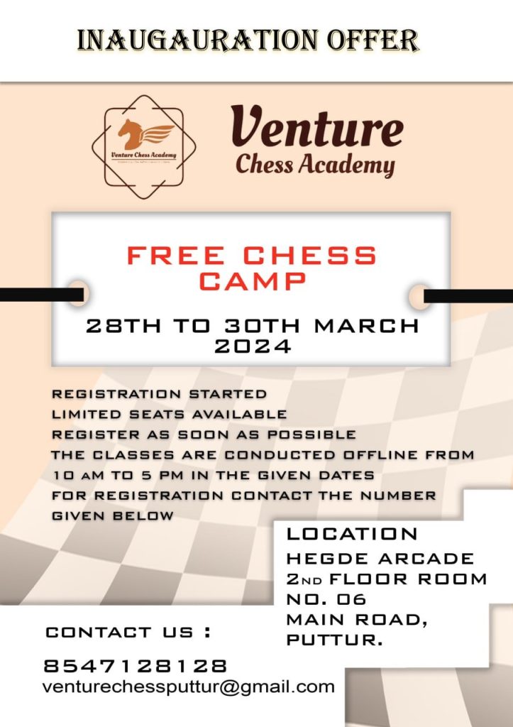 ಮಾರ್ಚ್ 28ರಿಂದ 30ರವರೆಗೆ ಬೆಳಗ್ಗೆ 10ರಿಂದ ಸಂಜೆ 5ರವರೆಗೆ ಪುತ್ತೂರಿನ ಹೆಗ್ಡೆ ಆರ್ಕೇಡ್(near shridar bhat shop)ನ ಕೊಠಡಿ ಸಂಖ್ಯೆ 6ರಲ್ಲಿ ಉಚಿತ ಚೆಸ್ ತರಬೇತಿ ಶಿಬಿರ ನಡೆಯಲಿದೆ. ಸೇರಲು ಇಚ್ಛಿಸುವವರು 8547128128 ಗೆ ಕರೆ ಮಾಡಿ ಎಂದು ಸಂಘಟಕರು ತಿಳಿಸಿದ್ದಾರೆ. https://forms.gle/j3VQRpB1iyi8EzeZA