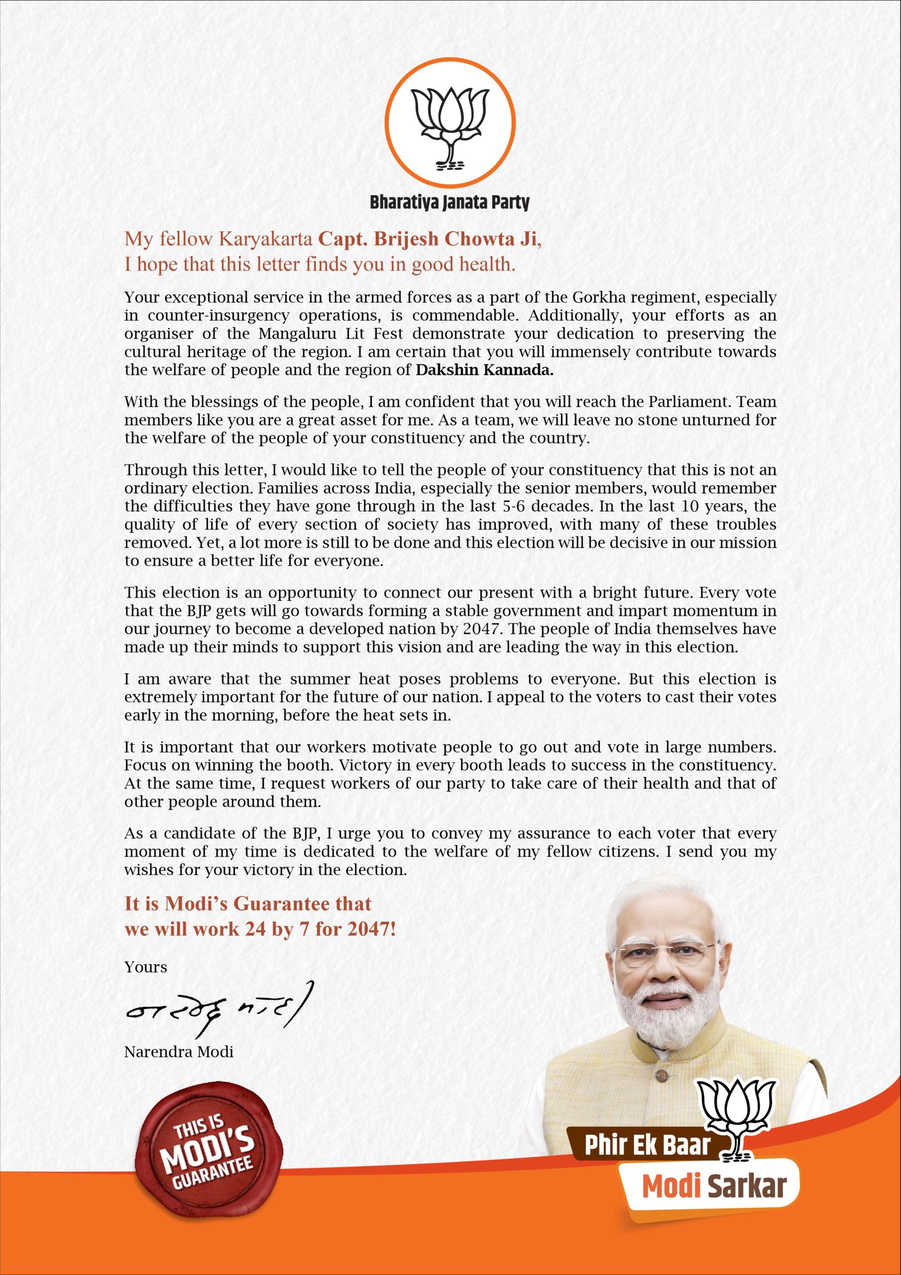 ಲೋಕಸಭಾ ಕ್ಷೇತ್ರದಲ್ಲಿ ಪ್ರತಿ ಬೂತ್ ಗೆಲ್ಲುವುದಕ್ಕಾಗಿ ನಮ್ಮ ಕಾರ್ಯಕರ್ತರು ಮತದಾರರಿಗೆ ಮತ ಹಾಕುವಂತೆ ಪ್ರೇರಣೆ ನೀಡುವುದು ಮುಖ್ಯವಾಗಿದೆ. ಪ್ರತಿ ಬೂತಿನಲ್ಲಿ ಅತಿ ಹೆಚ್ಚು ಮತ ಹಾಕಿಸಿ, ಬೂತ್ ಗೆದ್ದರೆ ಲೋಕಸಭೆ ಕ್ಷೇತ್ರವನ್ನು ಗೆಲ್ಲುವುದಕ್ಕೆ ಕೊಡುಗೆ ಕೊಟ್ಟಂತಾಗುತ್ತದೆ. ಇದೇ ವೇಳೆ, ಇತರ ಜನರಂತೆ ಪಕ್ಷದ ಕಾರ್ಯಕರ್ತರು ಕೂಡ ತಮ್ಮ ಆರೋಗ್ಯದ ಬಗ್ಗೆ ಕಾಳಜಿ ಇಟ್ಟುಕೊಳ್ಳಬೇಕಾಗಿದೆ. ದೇಶದ ಅಭಿವೃದ್ಧಿ ಮತ್ತು ಜನರ ಕಲ್ಯಾಣಕ್ಕಾಗಿ ಪ್ರತಿ ಕ್ಷಣದಲ್ಲೂ ಬದ್ದತೆ ಹೊಂದಿದ್ದೇನೆಂದು ಪ್ರತಿ ಮತದಾರನಿಗೂ ತಿಳಿಸಲು ಇಚ್ಚಿಸುತ್ತೇನೆ ಎಂದು ಪ್ರಧಾನಿ ಮೋದಿ, ದಕ್ಷಿಣ ಕನ್ನಡ ಜಿಲ್ಲೆಯ ಬಿಜೆಪಿ ಅಭ್ಯರ್ಥಿ ಕ್ಯಾ.ಬ್ರಿಜೇಶ್ ಚೌಟರಿಗೆ ಬರೆದ ಪತ್ರದಲ್ಲಿ ತಿಳಿಸಿದ್ದಾರೆ.