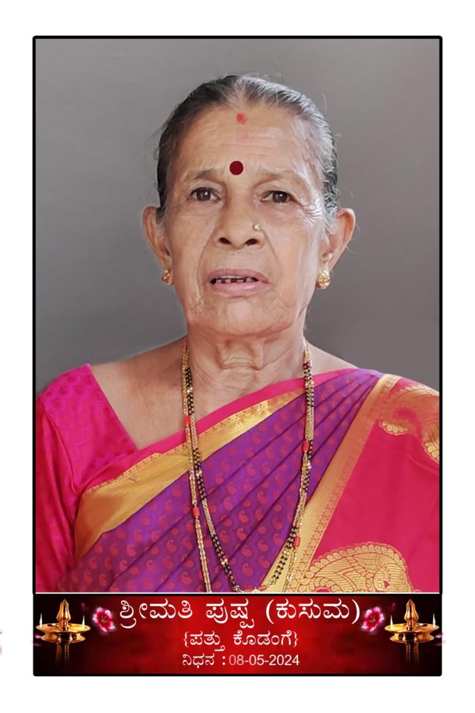 ಕಡೇಶಿವಾಲಯ ಗ್ರಾಮದ ಪತ್ತು ಕೊಡಂಗೆ ವಾಸು ಪೂಜಾರಿ ಧರ್ಮಪತ್ನಿ ಪುಷ್ಪ (ಕುಸುಮ ) 76 ವರ್ಷ ಮೇ.8ರಂದು ಬುಧವಾರ ಮಂಗಳೂರಿನ ಖಾಸಗಿ ಆಸ್ಪತ್ರೆಯಲ್ಲಿ ವಯೋಸಹಜ, ಅಲ್ಪ ಕಾಲದ ಅಸೌಖ್ಯದಿಂದ ನಿಧನರಾಗಿರುತ್ತಾರೆ.