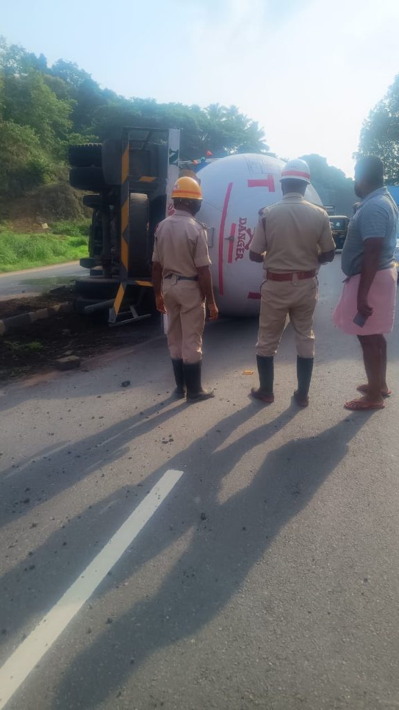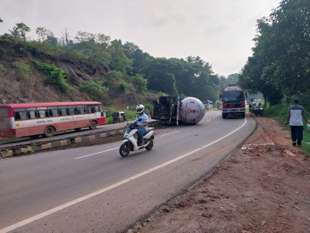 ಬಿ.ಸಿ.ರೋಡ್ ಮಂಗಳೂರು ರಸ್ತೆಯ ತುಂಬೆ ಸಮೀಪ ಕಡೆಗೋಳಿ ಎಂಬಲ್ಲಿ ಮಂಗಳೂರಿನಿಂದ ಆಗಮಿಸುತ್ತಿದ್ದ ಅನಿಲ ಟ್ಯಾಂಕರ್ ಒಂದು ಶುಕ್ರವಾರ ಬೆಳಗ್ಗೆ ಮಗುಚಿದೆ. ಅನಿಲ ತುಂಬಿಕೊಂಡಿದ್ದರೂ ಯಾವುದೇ ಸೋರಿಕೆ ಆಗದ ಕಾರಣ ಹೆಚ್ಚಿನ ಅಪಾಯ ತಪ್ಪಿಹೋಗಿದೆ. ಇದೀಗ ಅದರ ತೆರವು ಕಾರ್ಯಕ್ಕೆ ಕ್ರಮ ವಹಿಸಲಾಗುತ್ತಿದ್ದು, ವಾಹನ ಸಂಚಾರಕ್ಕೆ ಯಾವುದೇ ತೊಂದರೆ ಇಲ್ಲ. ಸ್ಥಳಕ್ಕೆ ಅಗ್ನಿಶಾಮಕ ಸಿಬಂದಿ, ಪೊಲೀಸ್ ಸಿಬಂದಿ ಹಾಗೂ ಸ್ಥಳೀಯರು ಆಗಮಿಸಿ ತೆರವಿಗೆ ಶ್ರಮಿಸುತ್ತಿದ್ದಾರೆ.