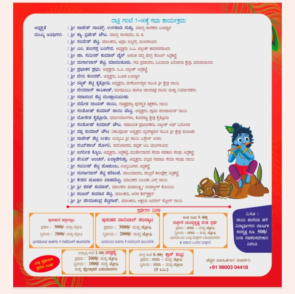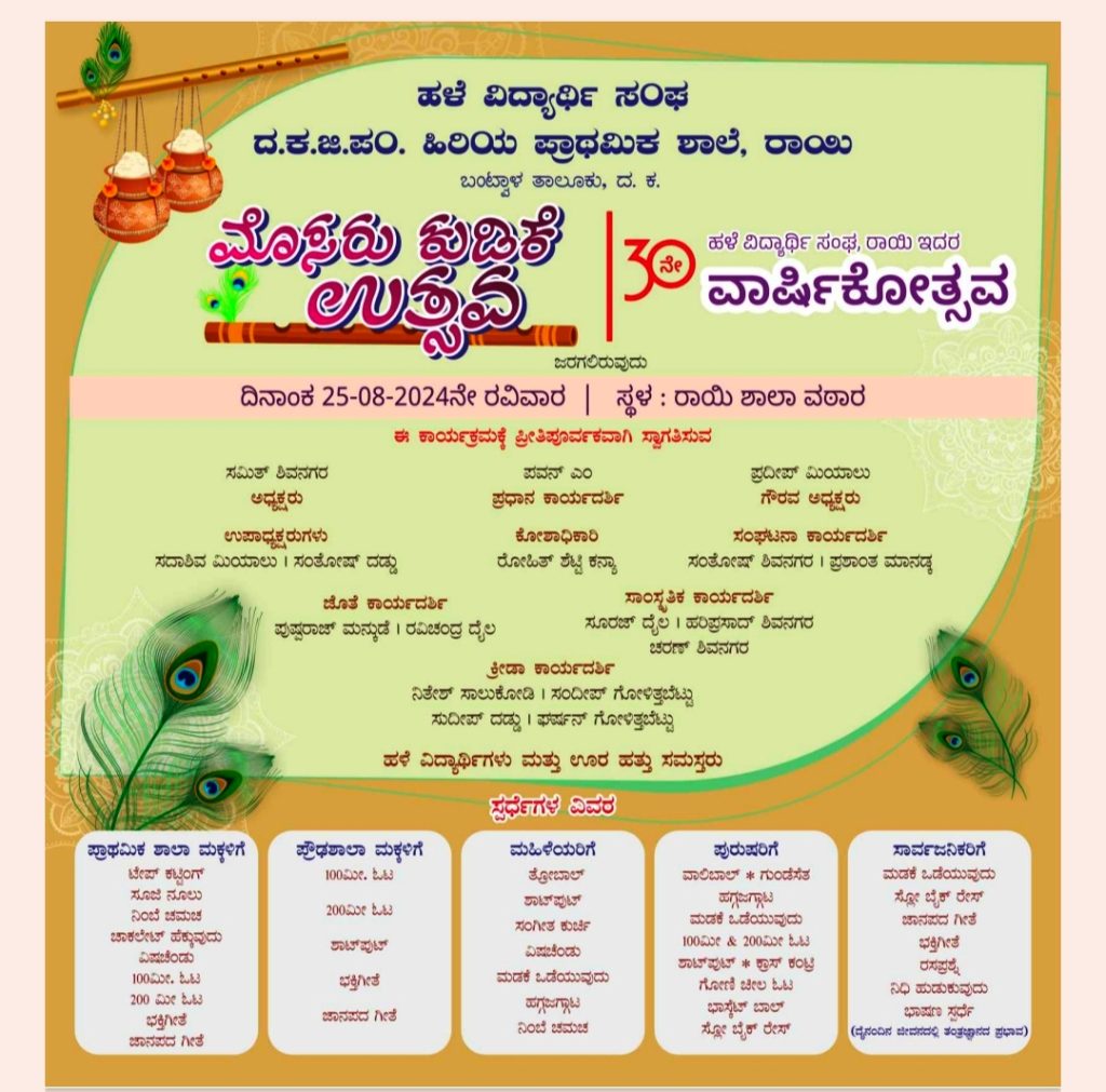 ದ.ಕ.ಜಿ.ಪ.ಹಿರಿಯ ಪ್ರಾಥಮಿಕ ಶಾಲೆ ರಾಯಿ ಇದರ ಹಳೆ ವಿದ್ಯಾರ್ಥಿ ಸಂಘದ ವತಿಯಿಂದ ನಡೆಯುವ ಮೊಸರು ಕುಡಿಕೆ ಉತ್ಸವ ಹಾಗೂ 30ನೇ ವರ್ಷದ ವಾರ್ಷಿಕೋತ್ಸವ ದ ಆಮಂತ್ರಣ ಪತ್ರಿಕೆ ಬಿಡುಗಡೆಯು ಅಧ್ಯಕ್ಷರು ಹಾಗೂ ಸದಸ್ಯರ ಉಪಸ್ಥಿತಿಯಲ್ಲಿ ರಾಯಿ ಶ್ರೀ ಮಹಾಲಿಂಗೇಶ್ವರ ದೇವಸ್ಥಾನ ದಲ್ಲಿ ನಡೆಯಿತು..
