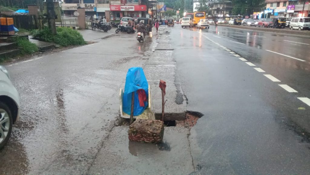 ಸರ್ವೀಸ್ ರಸ್ತೆಯಿಂದ ರಾಷ್ಟ್ರೀಯ ಹೆದ್ದಾರಿಗೆ ಸೇರುವ ಹಾಗೂ ಹೆದ್ದಾರಿಯಿಂದ ಬರುವ ಬಸ್ ಗಳು ಕೆ.ಎಸ್. ಆರ್.ಟಿ.ಬಸ್ ನಿಲ್ದಾಣಕ್ಕೆ ಸಂಪರ್ಕಿಸುವ ದಾರಿ ಮಧ್ಯೆ ಮಳೆ ನೀರು ಹರಿದು ಹೋಗುವ ಉದ್ದೇಶದಿಂದ ನಿರ್ಮಿಸಿದ ಚರಂಡಿಯ ಮೇಲೆ ಹಾಕಲಾಗಿರುವ ಸಿಮೆಂಟ್ ಸ್ಲಾಬ್ ಗಳು ಮುರಿದು ಬಿದ್ದ ಪರಿಣಾಮ ವಾಹನಗಳಿಗೆ ತೊಂದರೆಯಾಗಬಹುದು ಎಂಬ ದೃಷ್ಟಿಯಿಂದ ಸ್ಥಳೀಯರು ಎಚ್ಚರಿಕೆಗಾಗಿ ಕಲ್ಲು ಹಾಗೂ ಥರ್ಮೋಕೋಲ್ ಒಂದನ್ನು ಹಾಗಿ ಗಮನ ಸೆಳೆಯುತ್ತಿದ್ದಾರೆ. ಇಲ್ಲಿ ಸ್ಲ್ಯಾಬ್ ಮುರಿದುಬೀಳುವುದು ಆಗಾಗ್ಗೆ ಸಂಭವಿಸುತ್ತಿದ್ದು, ಧಾರಾಕಾರ ಮಳೆ ಬಂದಾಗ ವಾಹನಗಳು ಇದರೊಳಗೆ ಕುಸಿಯುವ ಆತಂಕವೂ ಇದೆ. ಸಂಬಂಧಿಸಿದ ಇಲಾಖೆ ಕೂಡಲೇ ಕ್ರಮ ಕೈಗೊಳ್ಳಬೇಕು ಎಂದು ಸ್ಥಳೀಯರು ಒತ್ತಾಯಿಸಿದ್ದಾರೆ.