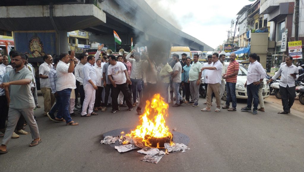 ಹೆದ್ದಾರಿ ತಡೆದ ಕಾಂಗ್ರೆಸ್ ಕಾರ್ಯಕರ್ತರು ಟಯರ್ ಗೆ ಕಿಚ್ಚಿಟ್ಟು ಆಕ್ರೋಶ ವ್ಯಕ್ತಪಡಿಸಿದರು.