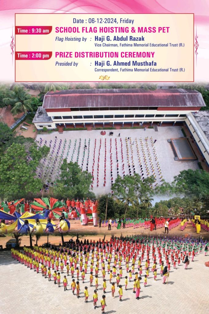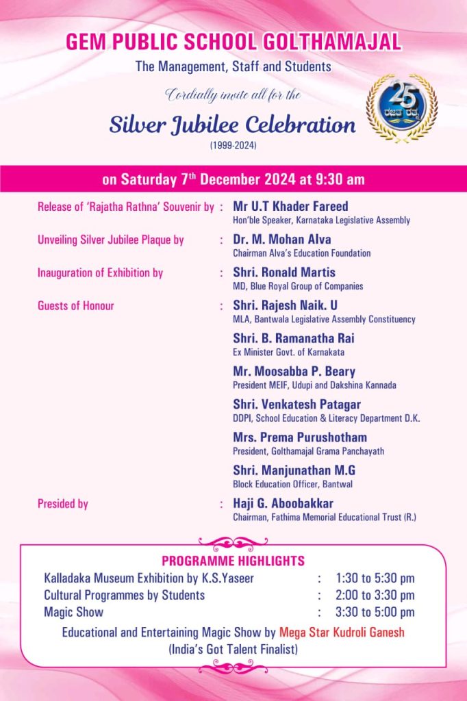 ಡಿ. 07 ರಂದು ನಡೆಯುವ ರಜತ ಮಹೋತ್ಸವ ಕಾರ್ಯಕ್ರಮದ ಅಧ್ಯಕ್ಷತೆಯನ್ನು ಫಾತಿಮಾ ಮೆಮೋರಿಯಲ್ ಎಜ್ಯುಕೇಶನಲ್ ಟ್ರಸ್ಟ್ ನ ಚೆಯರ್ಮೇನ್ ಹಾಜಿ ಜಿ. ಅಬೂಬಕ್ಕರ್ ಗೋಳ್ತಮಜಲು ವಹಿಸಲಿದ್ದು, ರಜತ ರತ್ನ ಸಂಚಿಕೆಯನ್ನು ಕರ್ನಾಟಕ ವಿಧಾನಸಭಾ ಸ್ಪೀಕರ್ ಯು.ಟಿ.ಖಾದರ್ ಬಿಡುಗಡೆಗೊಳಿಸುವರು. ಮೂಡುಬಿದಿರೆ ಆಳ್ವಾಸ್ ಶಿಕ್ಷಣ ಸಂಸ್ಥೆಯ ಚೆಯರ್ಮೇನ್ ಡಾ.ಎಂ.ಮೋಹನ್ ಆಳ್ವ ಧ್ವಜಾರೋಹಣ ನೆರವೇರಿಸುವರು.