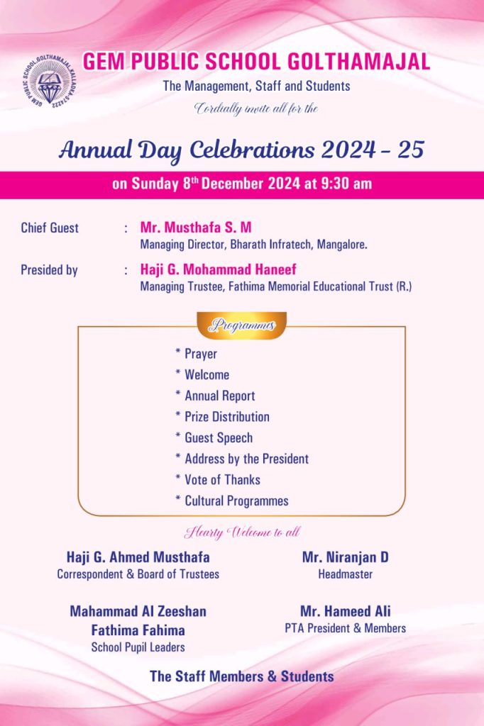 ಬಂಟ್ವಾಳ : ಗೋಳ್ತಮಜಲು ಜೆಮ್ ಪಬ್ಲಿಕ್ ಸ್ಕೂಲ್ ನ ರಜತ ಮಹೋತ್ಸವವು ಡಿ. 07ರಂದು ಹಾಗೂ ವಾರ್ಷಿಕೋತ್ಸವ ಕಾರ್ಯಕ್ರಮವು ಡಿ. 08 ರಂದು ನಡೆಯಲಿದೆ ಎಂದು ಶಾಲಾ ಸಂಚಾಲಕ ಹಾಜಿ ಜಿ.ಅಹಮದ್ ಮುಸ್ತಾಫ ಪತ್ರಿಕಾ ಪ್ರಕಟಣೆಯಲ್ಲಿ ತಿಳಿಸಿದ್ದಾರೆ.