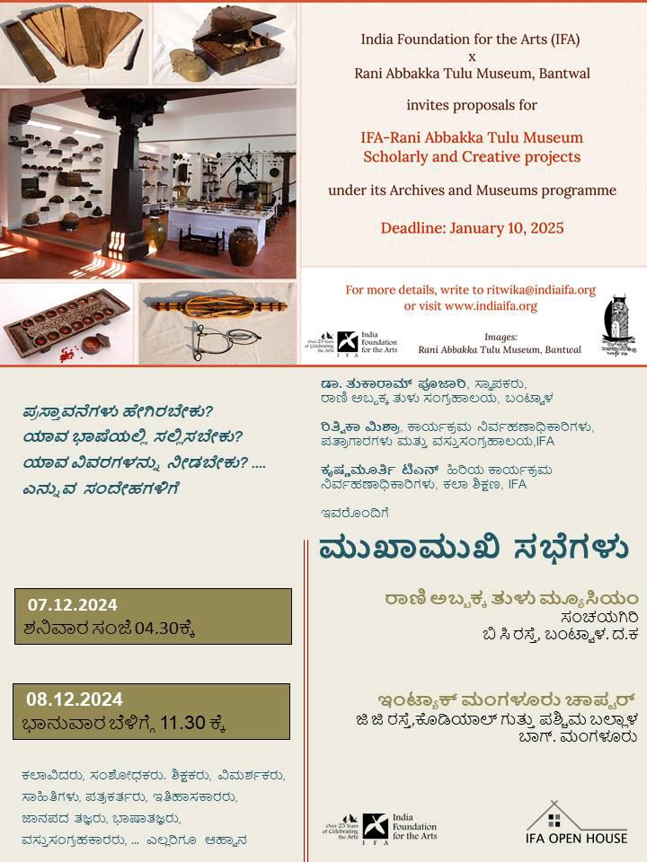 ಬಂಟ್ವಾಳ : ಐಎಫ್ಎ ಸಂಸ್ಥೆಯು ತನ್ನ ಆರ್ಕೈವ್ಸ್ ಮತ್ತು ಮ್ಯೂಸಿಯಂ ಕಾರ್ಯಕ್ರಮದಡಿಯಲ್ಲಿ ರಾಣಿ ಅಬ್ಬಕ್ಕ ತುಳು ಮ್ಯೂಸಿಯಂ ಸಹಯೋಗದೊಂದಿಗೆ ಐಎಫ್ಎ-ರಾಣಿ ಅಬ್ಬಕ್ಕ ತುಳು ಮೂಸಿಯಂ ಸ್ಕಾಲರ್ಲಿ (ವಿದ್ವತ್ಪೂರ್ಣ) ಅಂಡ್ ಕ್ರಿಯಟಿವ್ (ಮತ್ತು ಸೃಜನಶೀಲ) ಪ್ರಾಜೆಕ್ಷ್ಯಳಿಗಾಗಿ ಪ್ರಸ್ತಾವನೆಯ ಅರ್ಜಿಗಳನ್ನು ಆಹ್ವಾನಿಸಿದ್ದು, ಇದಕ್ಕೆ ಪೂರ್ವಭಾವಿಯಾಗಿ ಮುಖಾಮುಖಿ ಸಭೆಗಳನ್ನು ಡಿಸೆಂಬರ್ 7 ಮತ್ತು 8 ರಂದು ಬಿ.ಸಿ.ರೋಡು ಹಾಗೂ ಮಂಗಳೂರಿನಲ್ಲಿ ಆಯೋಜಿಸಿದೆ.
