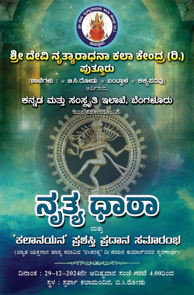 ಪುತ್ತೂರಿನ ಶ್ರೀದೇವಿ ನೃತ್ಯಾರಾಧನಾ ಕಲಾಕೇಂದ್ರ ವತಿಯಿಂದ ಕನ್ನಡ ಮತ್ತು ಸಂಸ್ಕೃತಿ ಇಲಾಖೆ ಸಹಯೋಗದೊಂದಿಗೆ ಬಂಟ್ವಾಳದ ಸ್ಪರ್ಶ ಕಲಾ ಮಂದಿರದಲ್ಲಿ ಡಿ.29ರಂದು ಸಂಜೆ 4ರಿಂದ ನೃತ್ಯಧಾರಾ ಮತ್ತು ಕಲಾನಯನ ಪ್ರಶಸ್ತಿ ಪ್ರದಾನ ಸಮಾರಂಭ ನಡೆಯಲಿದೆ.