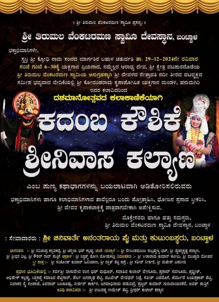 ಬಂಟ್ವಾಳ ಶ್ರೀ ತಿರುಮಲ ವೆಂಕಟರಮಣ ದೇವಸ್ಥಾನದ ನೇತ್ರಾವತಿ ನದೀ ತೀರದ ವಟವೃಕ್ಷದ ಸಮೀಪ ಭವ್ಯವಾದ ವೇದಿಕೆಯಲ್ಲಿ ಹನುಮಗಿರಿ ಶ್ರೀ ಕೋದಂಡರಾಮ ಕೃಪಾಪೋಷಿತ ಯಕ್ಷಗಾನ ಮಂಡಳಿ ವತಿಯಿಂದ ಕದಂಬ ಕೌಶಿಕೆ ಹಾಗೂ ಶ್ರೀನಿವಾಸ ಕಲ್ಯಾಣ ಎಂಬ ಯಕ್ಷಗಾನ ಪ್ರದರ್ಶನ ನಡೆಯಲಿದೆ.ಚಿನಿವಾರ್ತೆ ಅನಂತರಾಯ ಪೈ ಮತ್ತು ಕುಟುಂಬಸ್ಥರ ಸೇವಾರೂಪವಾಗಿ ಈ ಕಾರ್ಯಕ್ರಮ ಸಂಜೆ 6.30ರಿಂದ ಆರಂಭಗೊಳ್ಳಲಿದೆ ಎಂದು ಪ್ರಕಟಣೆ ತಿಳಿಸಿದೆ.
