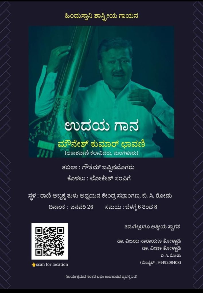 ಬಂಟ್ವಾಳ: ಆಕಾಶವಾಣಿ ಕಲಾವಿದ ಮೌನೇಶ್ ಕುಮಾರ್ ಛಾವಣಿ ಅವರಿಂದ ಉದಯಗಾನ ಬಿ.ಸಿ.ರೋಡಿನ ಸಂಚಯಗಿರಿಯಲ್ಲಿರುವ ರಾಣಿ ಅಬ್ಬಕ್ಕ ತುಳು ಅಧ್ಯಯನ ಕೇಂದ್ರದಲ್ಲಿ ನಡೆಯಲಿದೆ. ಜನವರಿ 26ರಂದು ಬೆಳಗ್ಗೆ 6ರಿಂದ 8ರವರೆಗೆ ಈ ಕಾರ್ಯಕ್ರಮ ನಡೆಯಲಿದ್ದು, ಅವರಿಗೆ ತಬಲಾದಲ್ಲಿ ಗೌತಮ್ ಜಪ್ಪಿನಮೊಗರು ಹಾಗೂ ಕೊಳಲುವಾದನದಲ್ಲಿ ಲೋಕೇಶ್ ಸಂಪಿಗೆ ಸಾಥ್ ನೀಡುವರು. ಕಲಾಸಕ್ತರು ಮುಂಜಾನೆ ನಡೆಯುವ ಹಿಂದುಸ್ತಾನಿ ಶಾಸ್ತ್ರೀಯ ಸಂಗೀತದ ಈ ಕಾರ್ಯಕ್ರಮದಲ್ಲಿ ಭಾಗವಹಿಸುವಂತೆ ಸಂಘಟಕರಾದ ಡಾ. ವಿಜಯನಾರಾಯಣ ತೋಳ್ಪಾಡಿ ಮತ್ತು ಡಾ.ವೀಣಾ ತೋಳ್ಪಾಡಿ ತಿಳಿಸಿದ್ದಾರೆ.