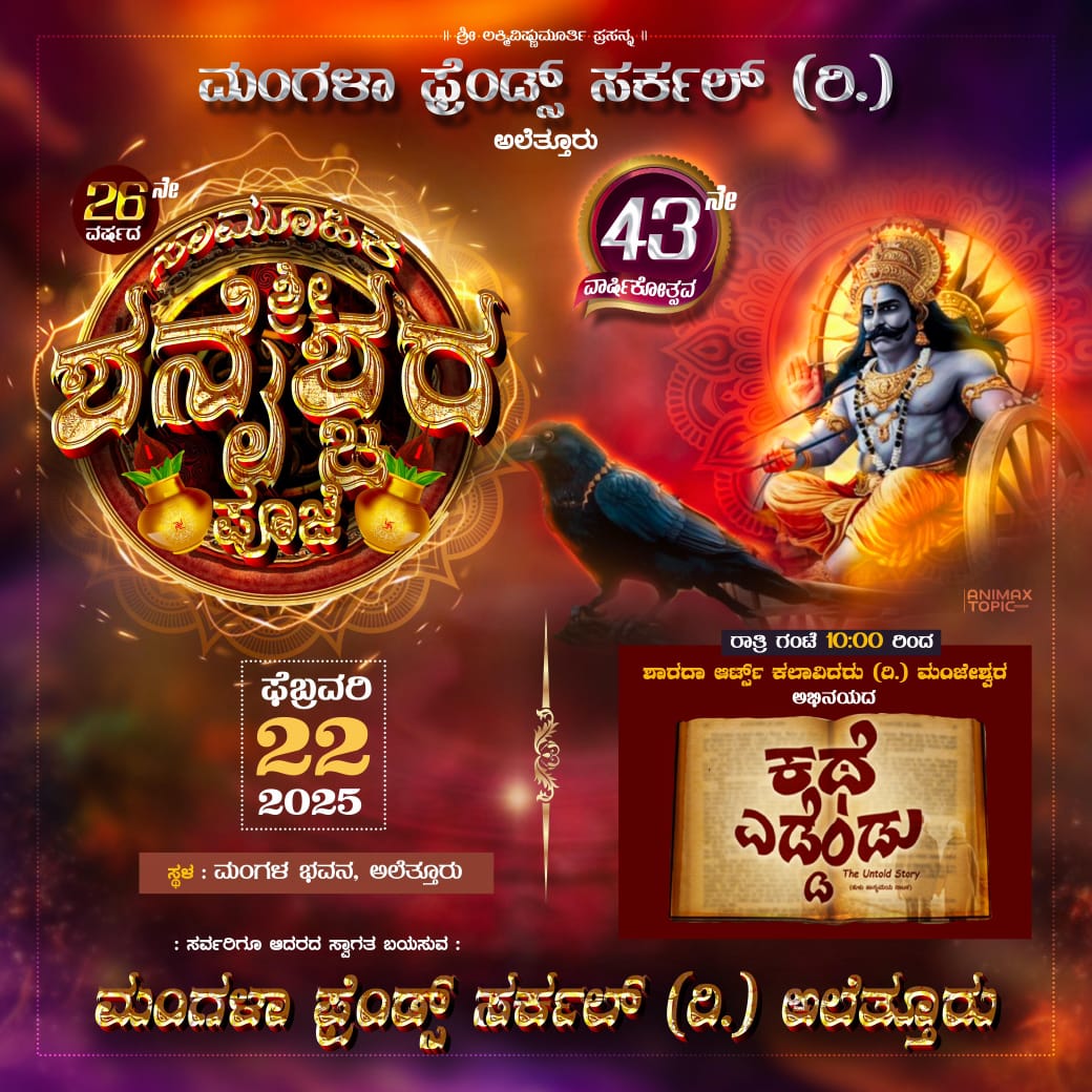 ಬಂಟ್ವಾಳ: ಫೆ.22ರ ಶನಿವಾರ ಬಿ.ಸಿ.ರೋಡಿನ ಅಲೆತ್ತೂರಿನಲ್ಲಿ ಮಂಗಳಾ ಫ್ರೆಂಡ್ಸ್ ಸರ್ಕಲ್ (ರಿ.) 25 ನೇ ವರ್ಷದ ಸಾರ್ವಜನಿಕ ಶನೈಶ್ವರ ಪೂಜೆ ಹಾಗೂ 43 ನೇ ವರ್ಷದ ವಾರ್ಷಿಕೋತ್ಸವ ನಡೆಯಲಿರುವುದು.