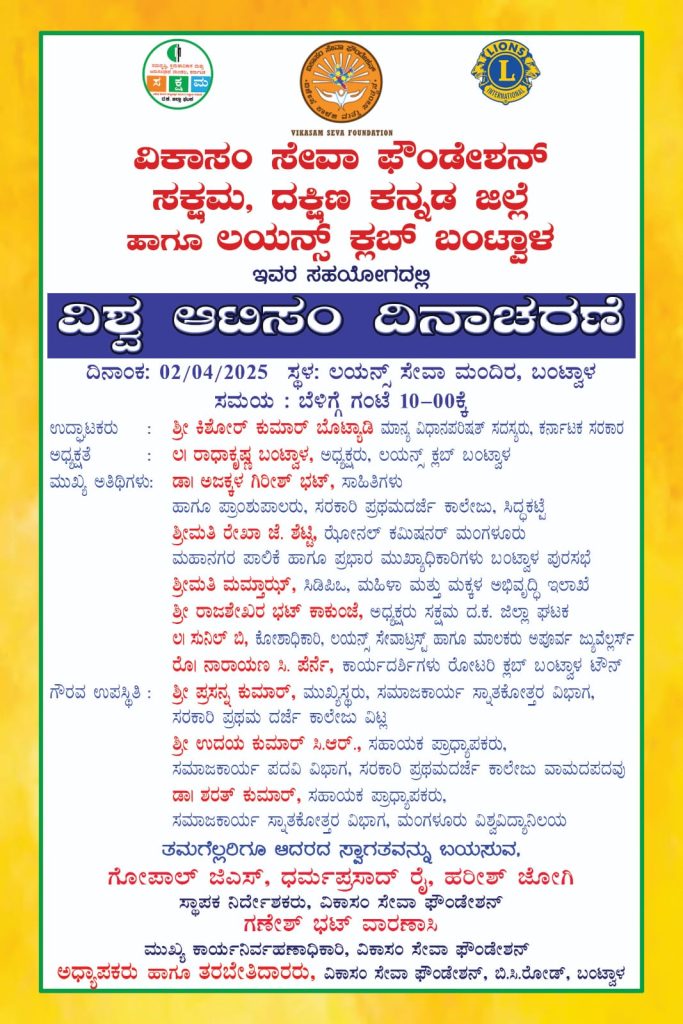 ದಿನಾಂಕ 02-04-2025 ರಂದು ವಿಕಾಸಂ ಸೇವಾ ಫೌಂಡೇಶನ್ ಸಕ್ಷಮ ದಕ್ಷಿಣ ಕನ್ನಡ ಘಟಕ ಹಾಗೂ ಲಯನ್ಸ್ ಕ್ಲಬ್ ಬಂಟ್ವಾಳ ಇದರ ಜೊತೆ ಸೇರಿಕೊಂಡು ವಿಶ್ವ ಆಟಿಸಂ ದಿನಾಚರಣೆ ಕಾರ್ಯಕ್ರಮವನ್ನು ಆಯೋಜಿಸಿದೆ. ವಿಧಾನ ಪರಿಷತ್ ಸದಸ್ಯರಾದ ಕಿಶೋರ್ ಕುಮಾರ್ ಬೊಟ್ಯಾಡಿ ಇವರು ಕಾರ್ಯಕ್ರಮದ ಉದ್ಘಾಟನೆಯನ್ಬು ಮಾಡಲಿದ್ದಾರೆ. ಕಾರ್ಯಕ್ರಮದ ಮುಖ್ಯ ಅತಿಥಿಗಳಾಗಿ ಹಿರಿಯ ಸಾಹಿತಿಗಳು ಹಾಗೂ ಸರಕಾರೀ ಪ್ರಥಮದರ್ಜೆ ಕಾಲೇಜು ಸಿದ್ಧಕಟ್ಟೆ ಇಲ್ಲಿನ ಪ್ರಾಂಶುಪಾಲರಾದ ಡಾ ಅಜಕ್ಕಳ ಗಿರೀಶ್ ಭಟ್, ಮಂಗಳೂರು ಮಹಾನಗರ ಪಾಲಿಕೆಯ ಝೋನಲ್ ಕಮಿಷನರ್ ಹಾಗೂ ಬಂಟ್ವಾಳ ಪುರಸಭೆಯ ಪ್ರಭಾರೀ ಮುಖ್ಯಾಧಿಕಾರಿ ಆಗಿರುವ ಶ್ರೀಮತೀ ರೇಖಾ ಜೆ ಶೆಟ್ಟಿ, ಬಂಟ್ವಾಳ ತಾಲೂಕು ಮಹಿಳಾ ಮತ್ತು ಮಕ್ಕಳ ಅಭಿವೃದ್ಧಿ ಇಲಾಖೆಯ ಸಿಡಿಪಿಒ ಆಗಿರುವ ಶ್ರೀಮತೀ ಮಮ್ತಾಜ್, ಸಕ್ಷಮ ಭಾರತ್ ಸಂಘಟನೆಯ ದಕ್ಷಿಣ ಕನ್ನಡ ಜಿಲ್ಲಾ ಪ್ರಮುಖರಾಗಿರುವ ರಾಜಶೇಖರ ಭಟ್ ಕಾಕುಂಜೆ, ಲಯನ್ಸ್ ಸೇವಾಟ್ರಸ್ಟ್ ನ ಕೋಶಾಧಿಕಾರಿಯಾಗಿರುವ ಹಾಗೂ ಅಪೂರ್ವ ಜ್ಯುವೆಲ್ಲರ್ಸ್ ನ ಮಾಲಕರಾಗಿರುವ ಲ| ಸುನಿಲ್ ಬಿ, ರೋಟರ್ ಕ್ಲಬ್ ಬಂಟ್ವಾಳ ಟೌನ್ ಇದರ ಕಾರ್ಯದರ್ಶಿಗಳಾದ ರೊ| ನಾರಾಯಣ ಸಿ ಪೆರ್ನೆ ಭಾಗವಹಿಸಲಿದ್ದಾರೆ.