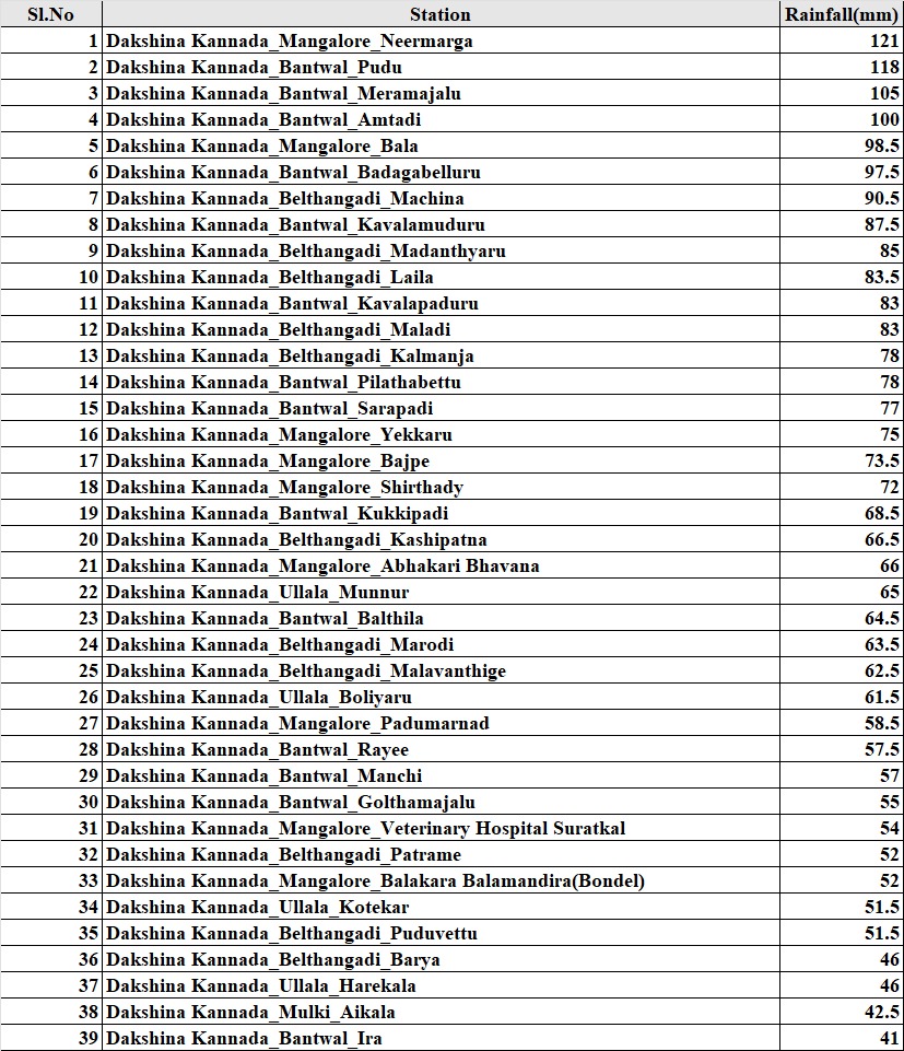 ಮಂಗಳೂರು ಸಹಿತ ದಕ್ಷಿಣ ಕನ್ನಡ ಜಿಲ್ಲೆಯಲ್ಲಿ ಶನಿವಾರ ಮಧ್ಯಾಹ್ನದ ಬಳಿಕ ಭಾರಿ ಮಳೆಯಾಗಿದೆ. ನೀರುಮಾರ್ಗದಲ್ಲಿ 121 ಮಿ.ಮೀ. ಮಳೆಯಾದರೆ, ಪುದುವಿನಲ್ಲಿ 118 ಮಿ.ಮೀ, ಮೇರೆಮಜಲುವಿನಲ್ಲಿ 105 ಮಿ.ಮೀ, ಅಮ್ಟಾಡಿಯಲ್ಲಿ 100 ಮಿ.ಮೀ, ಬಾಳದಲ್ಲಿ 98.5 ಮಿ.ಮೀ, ಬಡಗಬೆಳ್ಳೂರಿನಲ್ಲಿ 97.5 ಮಿ.ಮೀ, ಮಚ್ಚಿನದಲ್ಲಿ 90.5 ಮಿ.ಮೀ, ಕಾವಳಮುಡೂರಿನಲ್ಲಿ 87.5 ಮಿ.ಮೀ, ಮಡಂತ್ಯಾರಿನಲ್ಲಿ 86, ಲಾಯಿಲದಲ್ಲಿ 83.5, ಕಾವಳಪಡೂರಿನಲ್ಲಿ 83, ಮಾಲಾಡಿಯಲ್ಲಿ 83, ಕಲ್ಮಂಜದಲ್ಲಿ 78, ಪಿಲಾತಬೆಟ್ಟಿನಲ್ಲಿ 78, ಸರಪಾಡಿಯಲ್ಲಿ 77, ಎಕ್ಕಾರಿನಲ್ಲಿ 75, ಬಜಪೆಯಲ್ಲಿ 73.5, ಶಿರ್ತಾಡಿಯಲ್ಲಿ 72, ಕುಕ್ಕಿಪ್ಪಾಡಿಯಲ್ಲಿ 68.5, ಕಾಶಿಪಟ್ನದಲ್ಲಿ 66.5, ಮಂಗಳೂರಿನ ಅಬಕಾರಿ ಭವನ ಸಮೀಪ 66, ಉಳ್ಳಾಲ ಮುನ್ನೂರಿನಲ್ಲಿ 65 ಮಿ.ಮೀ. ಮಳೆ ಸುರಿದಿದೆ. ಉಳಿದ ವಿವರಗಳು ಇಲ್ಲಿವೆ.