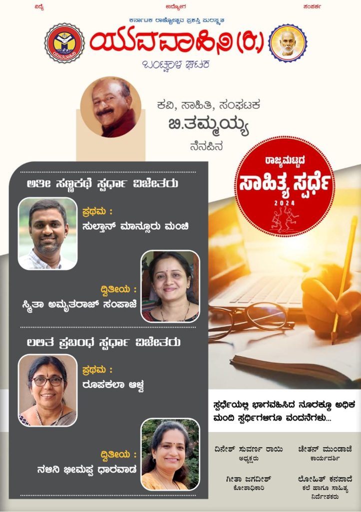 ಯುವವಾಹಿನಿ ಬಂಟ್ವಾಳ ಘಟಕವು ಸಾಹಿತ್ಯ ಬರವಣಿಗೆಗಳನ್ನು ಪ್ರೋತ್ಸಾಹಿಸುವ ಉದ್ದೇಶದಿಂದ ಕವಿ, ಸಾಹಿತಿ, ಸಂಘಟಕ ಬಿ.ತಮ್ಮಯ್ಯ ನೆನಪಿನ ರಾಜ್ಯಮಟ್ಟದ ಸಾಹಿತ್ಯ ಸ್ಪರ್ಧೆಯನ್ನು ಆಯೋಜಿಸಲಾಗಿತ್ತು. ಈ ಸಾಹಿತ್ಯ ಸ್ಪರ್ಧೆಯು ಸಾಹಿತ್ಯದ ಎರಡು ಪ್ರಕಾರಗಳನ್ನು ಕೇಂದ್ರೀಕರಿಸಿ ನಡೆಸಿದ್ದು ಅದರ ಫಲಿತಾಂಶ ಪ್ರಕಟಗೊಂಡಿದೆ. ಅತೀ ಸಣ್ಣಕಥೆ’ಸ್ಪರ್ಧೆಯಲ್ಲಿ ಸುಲ್ತಾನ್ ಮಾನ್ಸೂರು ಮಂಚಿ ಅವರ ಸಣ್ಣಕಥೆ ಜಾಥಾ ಪ್ರಥಮ ಸ್ಥಾನವನ್ನೂ, ಸ್ಮಿತಾ ಅಮೃತರಾಜ್ ಸಂಪಾಜೆ ಅವರ ಸಣ್ಣಕಥೆ ಸ್ಫೋಟ ದ್ವಿತೀಯ ಬಹುಮಾನ ಪಡೆದಿರುತ್ತದೆ.