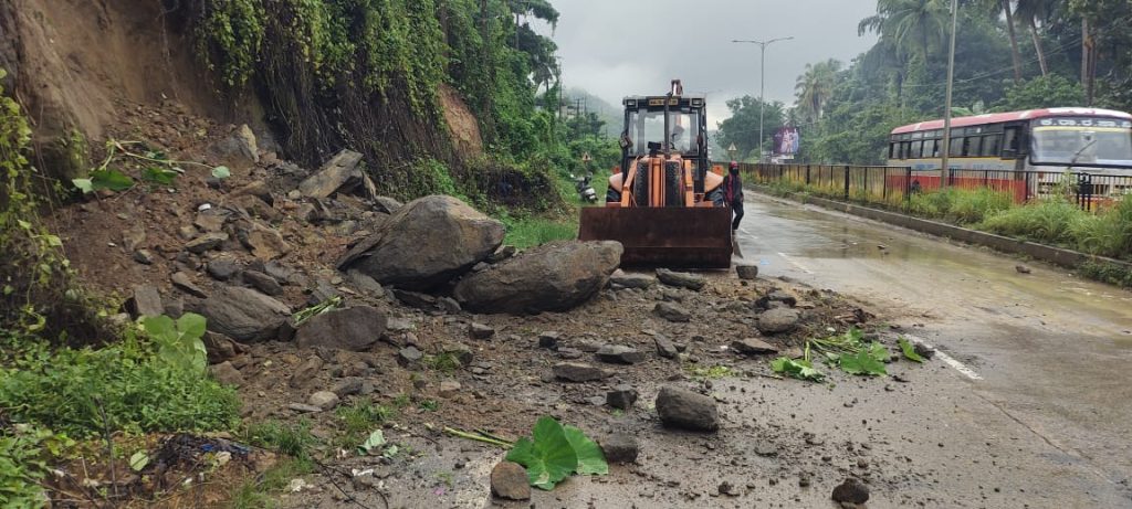 An incident occurred on Saturday afternoon when a stone along with mud fell onto the road near BhandaariBettu on the B.C. Road leading from Bantwal to Punjalkatte due to rain. It is said that the stone rolled onto the road when heavy winds caused the mud to collapse in the afternoon. Later, clearance operations were carried out by the BANTWAL municipal JCB. Municipal member Hariprasad and revenue department officials were present at the site.