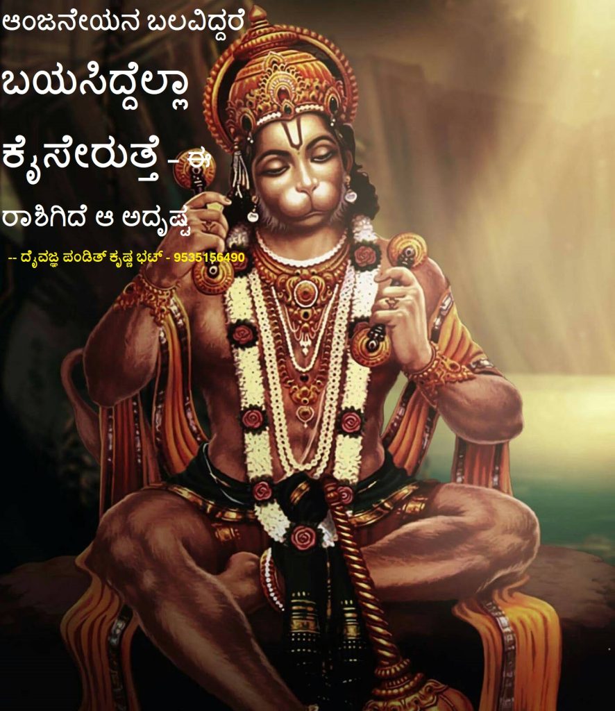 ಆಂಜನೇಯನ ಬಲವಿದ್ದರೆ, ಬಯಸಿದ್ದೆಲ್ಲಾ ಕೈಸೇರುತ್ತದೆ. ಯಾವ ರಾಶಿಗೆ ಈ ಸುಯೋಗ ಎಂಬ ಕುರಿತು ದೈವಜ್ಞ ಪಂಡಿತ್ ಕೃಷ್ಣ ಭಟ್ ಅವರು ತಮ್ಮ ಲೇಖನದಲ್ಲಿ ವಿವರಿಸಿದ್ದಾರೆ. ಹಲವು ಸಮಸ್ಯೆಗಳಿಗೆ ಅವರು ಪರಿಹಾರ ತಿಳಿಸುತ್ತಾರೆ ಅವರ ದೂರವಾಣಿ ಸಂಖ್ಯೆ ಹೀಗಿದೆ. 9535156490