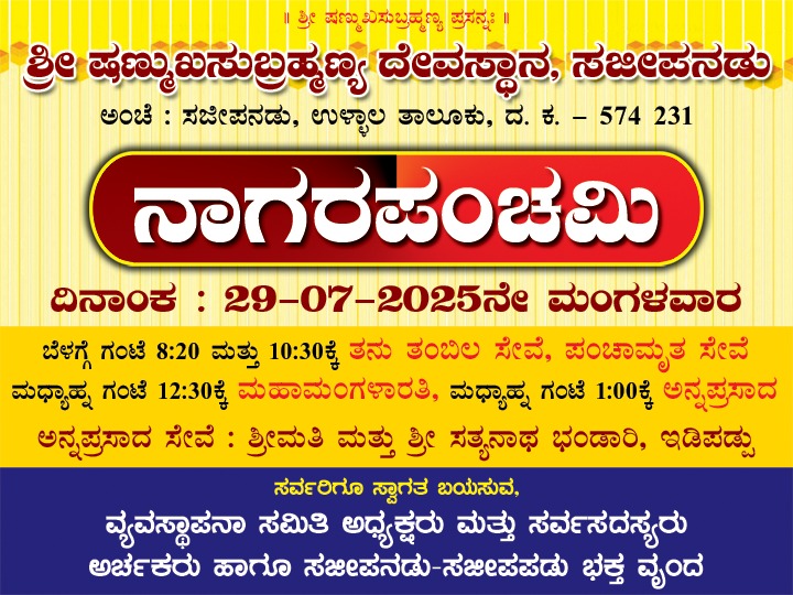 ನಾಗರಪಂಚಮಿ ಹಿನ್ನೆಲೆ ಉಳ್ಳಾಲ ತಾಲೂಕಿನ ಸಜೀಪನಡು ಗ್ರಾಮದ ಷಣ್ಮುಖ ಸುಬ್ರಹದ್ಮಣ್ಯದೇವಸ್ಥಾನದಲ್ಲಿ ವಿಶೇಷ ಸೇವೆಗಳು ನಡೆಯಲಿವೆ. 29ರಂದು ನಡೆಯುವ ನಾಗರಪಂಚಮಿಯಂದು ಬೆಳಗ್ಗೆ 8.20 ಮತ್ತು 10.30ಕ್ಕೆರಿಂದ ತನು ತಂಬಿಲ ಸೇವೆ, ಪಂಚಾಮೃತ ಸೇವೆ ನಡೆಯಲಿದೆ. ಮಧ್ಯಾಹ್ನ 12.30ಕ್ಕೆ ಮಹಾಮಂಗಳಾರತಿ, 1 ಗಂಟೆಗೆ ಅನ್ನಪ್ರಸಾದ ಸೇವೆ ಇರಲಿದ್ದು, ಸತ್ಯನಾಥ ಭಂಡಾರಿ ಇಡಿಪಡ್ಪು ದಂಪತಿ ಅನ್ನಪ್ರಸಾದ ಸೇವೆ ನಡೆಸಿಕೊಡಲಿದ್ದಾರೆ ಎಂದು ವ್ಯವಸ್ಥಾಪನಾ ಸಮಿತಿ ಅಧ್ಯಕ್ಷ ಮುಳ್ಳುಂಜ ವೆಂಕಟೇಶ್ವರ ಭಟ್ ತಿಳಿಸಿದ್ದಾರೆ.