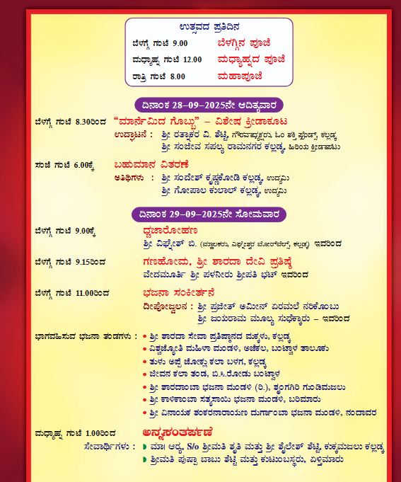 ಐದು ದಿನಗಳ ಈ ಕಾರ್ಯಕ್ರಮದಲ್ಲಿ ಸೆ.28ರಂದು ಮಾರ್ನೆಮಿದ ಗೊಬ್ಬು ಕ್ರೀಡಾಕೂಟ, ಸೆ.29ರಂದು ವೇ.ಮೂ.ಪಳನೀರು ಶ್ರೀಪತಿ ಭಟ್ ಅವರಿಂದ ಶಾರದಾಮಾತೆ ಪ್ರತಿಷ್ಠಾಪನೆ, ಧಾರ್ಮಿಕ ಕಾರ್ಯಕ್ರಮ ಹಾಗೂ ಸಭೆ ನಡೆಯಲಿದ್ದು, ಅಂದು ಪ್ರಶಸ್ತಿ ಪ್ರದಾನ ಮಾಡಲಾಗುವುದು. ಇದೇ ಸಂದರ್ಭ 44 ವರ್ಷಗಳ ಶಬರಿಮಲೆ ಯಾತ್ರೆ ಕೈಗೊಂಡ ಕಮಲ ಗುರುಸ್ವಾಮಿ ಕುಂಟಿಪಾಪು ಮತ್ತು ಸ್ವೋದ್ಯೋಗದಲ್ಲಿ ಸಾಧಕಿಯಾದ ನಾಗರತ್ನ ಪೂರ್ಲಿಪ್ಪಾಡಿ ಅವರಿಗೆ ಗ್ರಾಮಗೌರವ, ಸಾಧಕರಿಗೆ ಸನ್ಮಾನ, ಪ್ರತಿಭಾ ಪುರಸ್ಕಾರ ನೀಡಲಾಗುವುದು. ನಾಟಕ, ಸಾಂಸ್ಕೃತಿಕ ಕಾರ್ಯಕ್ರಮಗಳು ನಡೆಯಹಲಿದ್ದು, ವಿಜಯದಶಮಿಯಂತು ಶೋಭಾಯಾತ್ರೆಯೊಂದಿಗೆ ಉತ್ಸವ ಸಮಾಪನಗೊಳ್ಳಲಿದೆ ಎಂದು ಪ್ರತಿಷ್ಠಾನದ ಪ್ರಕಟಣೆ ತಿಳಿಸಿದೆ.