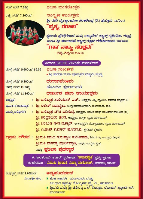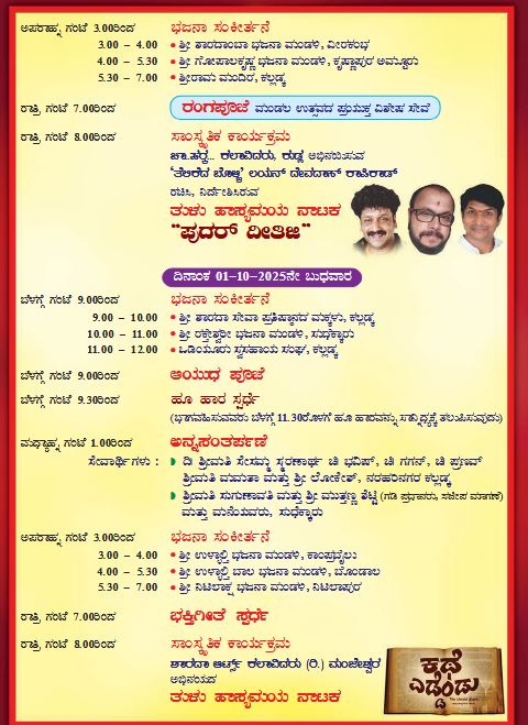 ಅಲ್ಲದೆ ಪುದರ್ ದೀತಿಜಿ, ಕಥೆ ಎಡ್ಡೆಂಡು ನಾಟಕ, ನೃತ್ಯರಂಜನಿ, ಗಾನ ನಾಟ್ಯ ಸಂಭ್ರಮ ಗಳ ಸಾಂಸ್ಕೃತಿಕ ಕಾರ್ಯಕ್ರಮಗಳು ನಡೆಯಲಿದೆ. ವಿಜಯದಶಮಿಯಂದು ವಿಜ್ರಂಭಣೆಯ ಶೋಭಾಯಾತ್ರೆ ಯೊಂದಿಗೆ ಉತ್ಸವವು ಸಮಾಪನಗೊಳ್ಳಲಿದೆ ಎಂದು KALLADKA SHARADA SEVA PRATISTANA ಪ್ರತಿಷ್ಠಾನದ ಅಧ್ಯಕ್ಷ ಯತೀನ್ ಕುಮಾರ್ ಹಾಗೂ ಕಾರ್ಯದರ್ಶಿ ವಜ್ರನಾಥ ಕಲ್ಲಡ್ಕ, SHARADA POOJA UTSAVA SAMITI KALLADKA ಶಾರದಾ ಪೂಜಾ ಉತ್ಸವ ಸಮಿತಿ ಅಧ್ಯಕ್ಷ ಯೋಗೀಶ್ ಪೂಜಾರಿ ಕಲ್ಲಡ್ಕ ಹಾಗೂ ಕಾರ್ಯದರ್ಶಿ ಪ್ರಮಿತ್ ಶೆಟ್ಟಿ ಕುಕ್ಕಮಜಲು ಪ್ರಕಟಣೆಯಲ್ಲಿ ತಿಳಿಸಿದ್ದಾರೆ. ಕಲ್ಲಡ್ಕ ಶಾರದೋತ್ಸವದ ವಿವರಗಳು ಇಲ್ಲಿವೆ
