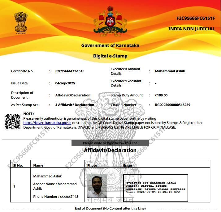 - ವಿವರಗಳನ್ನು ಭರ್ತಿ ಮಾಡಿ: ಡಾಕ್ಯುಮೆಂಟ್ನ ವಿವರಗಳು, ಸ್ಟ್ಯಾಂಪ್ ಪೇಪರ್ನ ಮೊತ್ತ ಇತ್ಯಾದಿ ಅಗತ್ಯವಿರುವ ಮಾಹಿತಿಯನ್ನು ನಮೂದಿಸಿ.