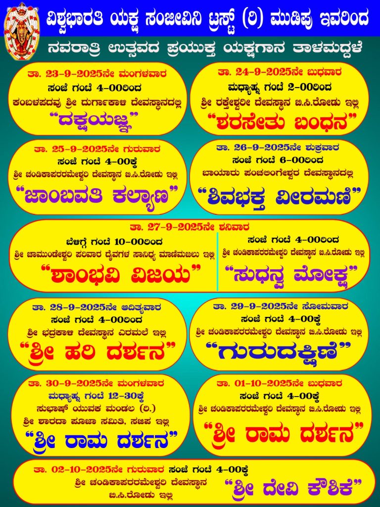 ಮುಡಿಪುವಿನ ವಿಶ್ವಭಾರತಿ ಯಕ್ಷ ಸಂಜೀವಿನಿ ಟ್ರಸ್ಟ್ ವತಿಯಿಂದ ಕಾರ್ಯಕ್ರಮಗಳು ನಡೆಯುತ್ತಿದ್ದು, 25ರಂದು ಜಾಂಬವತಿ ಕಲ್ಯಾಣ, 27ರಂದು ಸಂಜೆ ಸುಧನ್ವ ಮೋಕ್ಷ ತಾಳಮದ್ದಳೆ ನಡೆಯಿತು. 29ರಂದು ಗುರುದಕ್ಷಿಣೆ, ಅಕ್ಟೋಬರ್ 1ರಂದು ಶ್ರೀರಾಮ ದರ್ಶನ ಹಾಗೂ 2ರಂದು ಶ್ರೀದೇವಿ ಕೌಶಿಕೆ ತಾಳಮದ್ದಳೆ ನಡೆಯಲಿದೆ ಎಂದು ಈ ಸಂದರ್ಭ ಟ್ರಸ್ಟ್ ಮುಖ್ಯಸ್ಥ ಪ್ರಶಾಂತ್ ಹೊಳ್ಳ ತಿಳಿಸಿದರು.