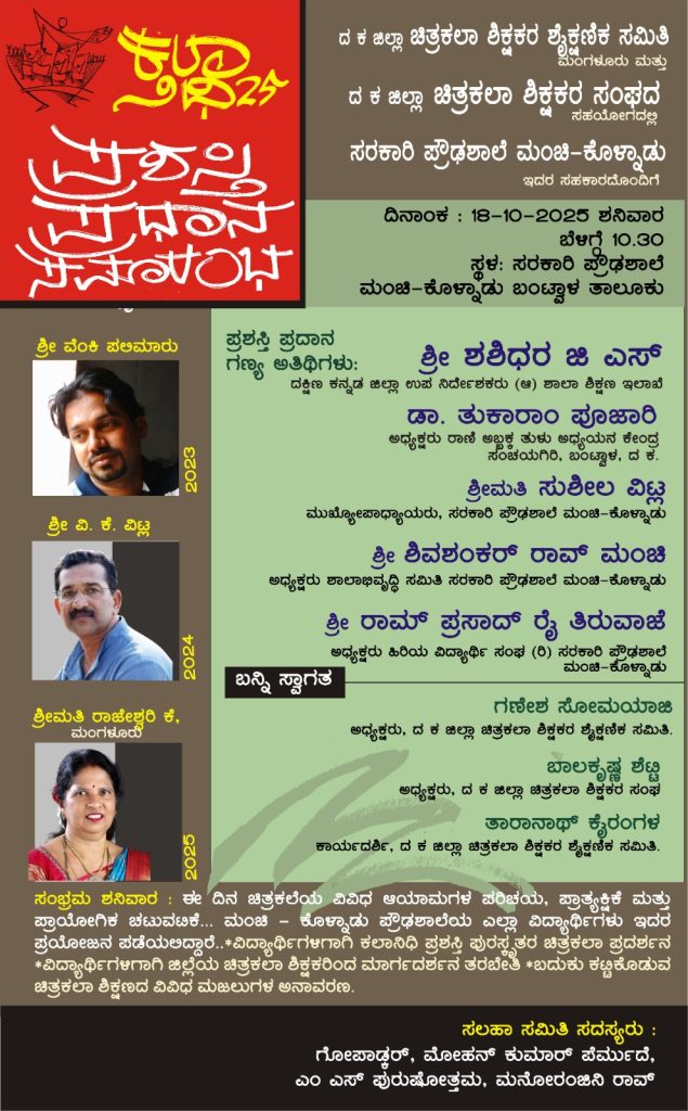 Be the first to comment on "ದಕ್ಷಿಣ ಕನ್ನಡ ಜಿಲ್ಲೆಯ ಮೂವರು ಸಾಧಕ ಚಿತ್ರಕಲಾ ಶಿಕ್ಷಕರು ಕಲಾನಿಧಿ ಪ್ರಶಸ್ತಿ ಪುರಸ್ಕಾರಕ್ಕೆ ಆಯ್ಕೆ"