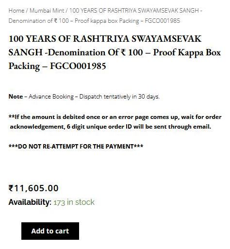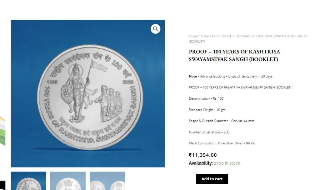 www.indiagovtmint.in ವೆಬ್ ಸೈಟ್ ಗೆ ಹೋಗಿ “100 YEARS OF RASHTRIYA SWAYAMSEVAK SANGH -Denomination of ₹ 100 – Proof kappa box Packing”. ಎಂಬ ಸಂದೇಶವುಳ್ಳದ್ದಕ್ಕೆ ಕ್ಲಿಕ್ ಮಾಡಬೇಕು. ಹಾಗೂ ಅದರಲ್ಲಿರುವ ಸಂದೇಶಗಳನ್ನು ಓದಿ ಪೇಮೆಂಟ್ ಮಾಡಿದ ಬಳಿಕವಷ್ಟೇ ಕಾಯಿನ್ ನಿಮ್ಮ ಅಡ್ರೆಸ್ ಗೆ ಬರುತ್ತದೆ.ಈ ವೆಬ್ ಸೈಟ್ ಸ್ಕ್ರೋಲ್ ಮಾಡ್ತಾ ಹೋದಂತೆ browse coin by mints ಎಂದು ನೋಡಿದಾಗ ಹೈದರಾಬಾದ್, ಬಾಂಬೆ ಮತ್ತು ಕೋಲ್ಕತ್ತಾ ಮಿಂಟ್ ಎಂಬ ವಿಭಾಗ ಸಿಗುತ್ತದೆ. ಸದ್ಯ ಆರೆಸ್ಸೆಸ್ ಕಾಯಿನ್ ಬಾಂಬೆಮಿಂಟ್ ಮತ್ತು ಕೋಲ್ಕತ್ತಾ ಮಿಂಟ್ ನಲ್ಲಿ ಲಭ್ಯವಿದೆ.