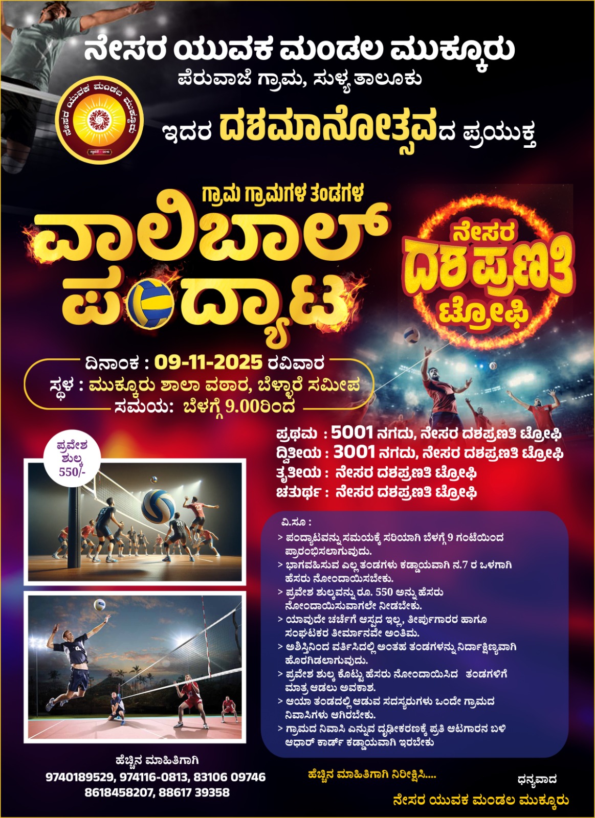 ಬೆಳ್ಳಾರೆ : ನೇಸರ ಯುವಕ ಮಂಡಲ ಮುಕ್ಕೂರು ಇದರ ದಶಮಾನೋತ್ಸವದ ಪ್ರಯುಕ್ತ ಪುರುಷರ ವಿಭಾಗದ ಸಿಂಗಲ್ ಗ್ರಿಪ್ ಮತ್ತು ಲೆವಲ್ ಮಾದರಿಯ ಹಗ್ಗಜಗ್ಗಾಟ ಹಾಗೂ ಗ್ರಾಮ ಗ್ರಾಮಗಳ ತಂಡದ ನಡುವಿನ ವಾಲಿಬಾಲ್ ಪಂದ್ಯಾಟವು 09-11-2025 ರಂದು ಸುಳ್ಯ ತಾಲೂಕಿನ ಪೆರುವಾಜೆ ಗ್ರಾಮದ ಮುಕ್ಕೂರು ಶಾಲಾ ವಠಾರದಲ್ಲಿ ಜರುಗಲಿದೆ.
