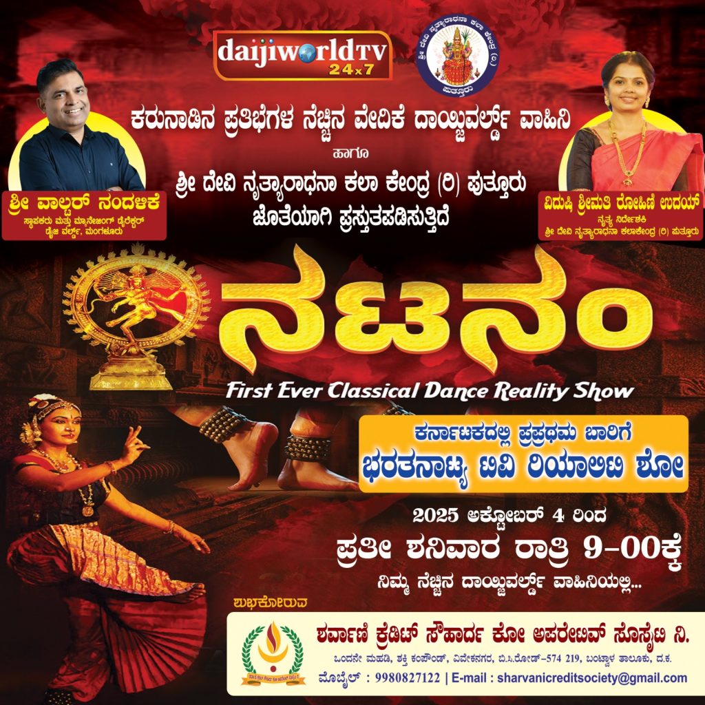 ಮಂಗಳೂರು: ಶ್ರೀದೇವಿ ನೃತ್ಯಾರಾಧನಾ ಕಲಾ ಕೇಂದ್ರ (ರಿ) ಪುತ್ತೂರು ಹಾಗೂ ದಾಯ್ಜಿವರ್ಲ್ಡ್ ವಾಹಿನಿ ವತಿಯಿಂದ ಭರತನಾಟ್ಯ ಟಿವಿ ರಿಯಾಲಿಟಿ ಶೋ (ಕರ್ನಾಟಕದಲ್ಲಿ ಪ್ರಥಮ ಬಾರಿಗೆ) ಪ್ರತಿ ಶನಿವಾರ ರಾತ್ರಿ 9ಕ್ಕೆ ನಡೆಯಲಿದೆ. ದಾಯ್ಜಿವರ್ಲ್ಡ್ ಟಿ.ವಿ.ವಾಹಿನಿಯಲ್ಲಿ ಪ್ರಸಾರಗೊಳ್ಳುವ ನಟನಂ ಹೆಸರಿನ ಈ ಕಾರ್ಯಕ್ರಮದಲ್ಲಿ ಭರತನಾಟ್ಯ ಪ್ರತಿಭೆಗಳ ಪ್ರದರ್ಶನವಿರಲಿದೆ ಎಂದು ಶ್ರೀದೇವಿ ನೃತ್ಯಾರಾಧನಾ ಕಲಾ ಕೇಂದ್ರದ ನೃತ್ಯ ನಿರ್ದೇಶಕಿ ರೋಹಿಣಿ ಉದಯ್ ಪ್ರಕಟಣೆಯಲ್ಲಿ ತಿಳಿಸಿದ್ದಾರೆ.