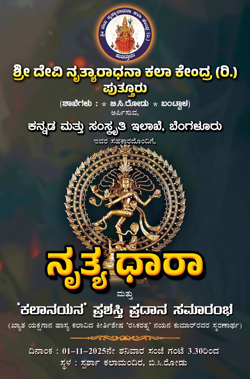 ಬಂಟ್ವಾಳ, ಬಿ.ಸಿ.ರೋಡ್ ನಲ್ಲಿ ಶಾಖೆಗಳನ್ನು ಹೊಂದಿರುವ ಶ್ರೀದೇವಿ ನೃತ್ಯಾರಾಧನಾ ಕಲಾ ಕೇಂದ್ರ (ರಿ), ಪುತ್ತೂರು ವತಿಯಿಂದ ಕನ್ನಡ ಮತ್ತು ಸಂಸ್ಕೃತಿ ಇಲಾಖೆ, ಬೆಂಗಳೂರು ಸಹಕಾರದೊಂದಿಗೆ ನೃತ್ಯಧಾರಾ ಮತ್ತು ಯಕ್ಷಗಾನ ಹಾಸ್ಯ ಕಲಾವಿದ ಕೀರ್ತಿಶೇಷ ರಸಿಕರತ್ನ ನಯನಕುಮಾರ್ ಸ್ಮರಣಾರ್ಥ ಕಲಾನಯನ ಪ್ರಶಸ್ತಿ ಪ್ರದಾನ ಸಮಾರಂಭ ನವೆಂಬರ್ 1ರಂದು ಶನಿವಾರ ಸಂಜೆ 3.30ರಿಂದ ಬಿ.ಸಿ.ರೋಡ್ ಸ್ಪರ್ಶ ಕಲಾ ಮಂದಿರದಲ್ಲಿ ನಡೆಯಲಿದೆ.