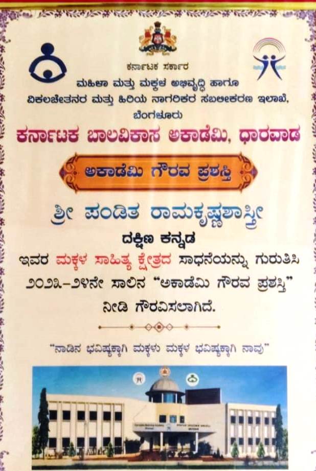 ಹೀಗಾಗಿಯೇ ಅವರು ಮಕ್ಕಳ ಸಾಹಿತ್ಯ ಕ್ಷೇತ್ರಕ್ಕೆ ಸಲ್ಲಿಸಿದ ಸೇವೆ ಗಮನಿಸಿ ಬೆಳಗಾವಿಯ ಸುವರ್ಣಸೌಧ ದಲ್ಲಿ ಮಹಿಳಾ ಮತ್ತು ಮಕ್ಕಳ ಕಲ್ಯಾಣ ಇಲಾಖೆ ಸಚಿವೆ ಲಕ್ಷ್ಮೀ ಹೆಬ್ಬಾ ಳ್ಕರ್ ಅವರು ಮಹಿಳಾ ಮತ್ತು ಮಕ್ಕಳ ಕಲ್ಯಾಣ ಇಲಾಖೆ ಮೂಲಕ ನೀಡಲಾಗುವ 2023-24ನೇ ಸಾಲಿನ ಬಾಲ ಸಾಹಿತ್ಯ ಅಕಾಡಮಿ ಗೌರವ ಪ್ರಶಸ್ತಿಯನ್ನು ನೀಡಿ ಗೌರವಿಸಿದರು