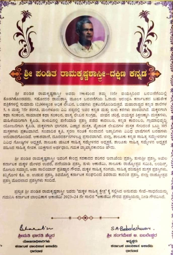 Be the first to comment on "ಪ.ರಾಮಕೃಷ್ಣ ಶಾಸ್ತ್ರಿ ಅವರಿಗೆ ಕರ್ನಾಟಕ ಬಾಲಸಾಹಿತ್ಯ ಅಕಾಡೆಮಿ ಗೌರವ ಪುರಸ್ಕಾರ ಪ್ರದಾನ"