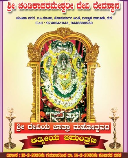 ಬಂಟ್ವಾಳ: ಫೆ.12ರಿಂದ 14ರವರೆಗೆ ಬಿ.ಸಿ.ರೋಡಿನ ಚಂಡಿಕಾನಗರದಲ್ಲಿರುವ ಶ್ರೀ ಚಂಡಿಕಾಪರಮೇಶ್ವರಿ ದೇವಿ ದೇವಸ್ಥಾನದ ಜಾತ್ರಾ ಮಹೋತ್ಸವಾದಿಗಳು ನಡೆಯಲಿವೆ.