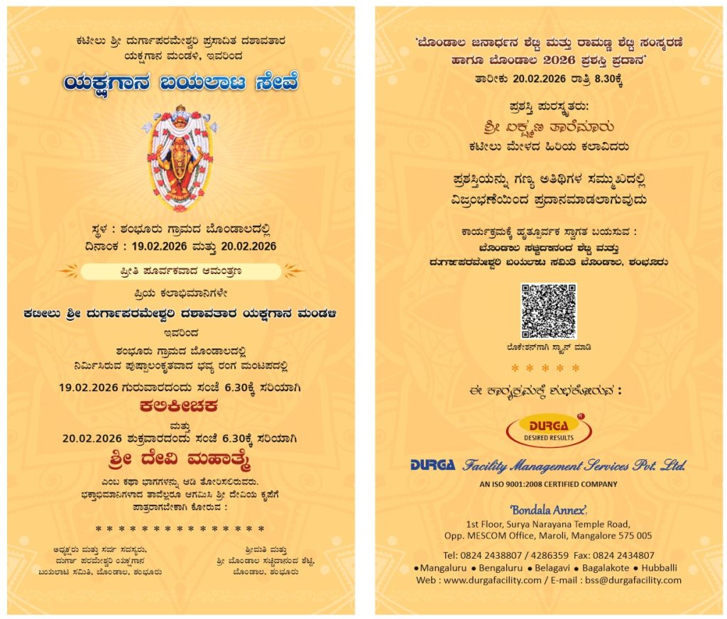 ಫೆಬ್ರವರಿ 19ರಂದು ರಾತ್ರಿ ಬಂಟ್ವಾಳ ತಾಲೂಕು ಶಂಭೂರು ಗ್ರಾಮದ ಬೊಂಡಾಲದಲ್ಲಿ ಶ್ರೀ ದುರ್ಗಾಪರಮೇಶ್ವರಿ ಬಯಲಾಟ ಸೇವಾ ಸಮಿತಿ ಮತ್ತು ಹತ್ತು ಸಮಸ್ತರ ವತಿಯಿಂದ ‘ಕಲಿ ಕೀಚಕ’ ಹಾಗೂ ಮರುದಿನ ಬೊಂಡಾಲ ಚಾರಿಟೇಬಲ್ ಟ್ರಸ್ಟ್ ವತಿಯಿಂದ ‘ಶ್ರೀದೇವಿ ಮಹಾತ್ಮೆ’ ಸೇವಾ ಬಯಲಾಟಗಳು ಜರಗಲಿವೆ