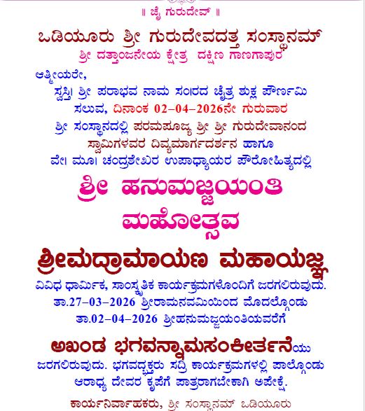 ಒಡಿಯೂರು: ಶ್ರೀ ಕ್ಷೇತ್ರ ಒಡಿಯೂರಿನಲ್ಲಿ ಶ್ರೀ ಗುರುದೇವದತ್ತ ಸಂಸ್ಥಾನಂನ ಶ್ರೀ ಗುರುದೇವಾನಂದ ಸ್ವಾಮೀಜಿ ಮಾರ್ಗದರ್ಶನದಲ್ಲಿ ಹನುಮಜ್ಜಯಂತಿ ಮಹೋತ್ಸವ, ಶ್ರೀಮದ್ರಾಮಾಯಣ ಮಹಾಯಜ್ಞ ಕಾರ್ಯಕ್ರಮಗಳು ಮಾರ್ಚ್ 27ರ ಶ್ರೀರಾಮನವಮಿಯಿಂದ ಏಪ್ರಿಲ್ 2ರ ಶ್ರೀ ಹನುಮಜ್ಜಯಂತಿಯವರೆಗೆ ಅಖಂಡ ಭಗವನ್ನಾಮಸಂಕೀರ್ತನೆಯೊಂದಿಗೆ ನಡೆಯಲಿದೆ.
