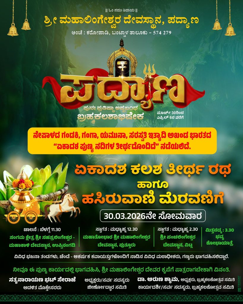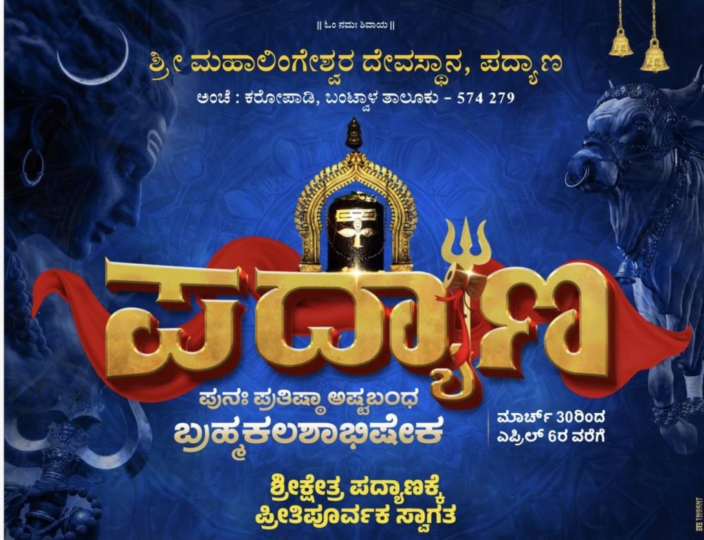 ದಕ್ಷಿಣ ಕನ್ನಡ ಜಿಲ್ಲೆಯ ಬಂಟ್ವಾಳ ತಾಲೂಕಿನ ಕರೋಪಾಡಿ ಗ್ರಾಮದ ಪುಟ್ಟ ಊರು ಪದ್ಯಾಣ. ಈ ಊರಿನ ಸುತ್ತಮುತ್ತಲೂ ಹಸಿರು ಹೊದ್ದುಕೊಂಡಂತಿದೆ. ಸುಂದರವಾದ ಈ ಪ್ರಕೃತಿಯ ರಮ್ಯ ಮಡಿಲಲ್ಲಿರುವ ಪದ್ಯಾಣ ಶ್ರೀ ಮಹಾಲಿಂಗೇಶ್ವರ ದೇವಸ್ಥಾನವು ಬಹು ಪುರಾತನ ಹಾಗೂ ಕಾರಣಿಕ ಕ್ಷೇತ್ರವಾಗಿದೆ. 2026ರ ಮಾರ್ಚ್ 30ರಿಂದ ಏಪ್ರಿಲ್ 6ರವರೆಗೆ ಬ್ರಹ್ಮಕಲಶೋತ್ಸವಕ್ಕೆ ಕ್ಷೇತ್ರ ಸಜ್ಜಾಗಿ ನಿಂತಿದೆ. ಊರ, ಪರವೂರ ಭಕ್ತರು ಪ್ರತಿದಿನ ನಡೆಯುವ ಧಾರ್ಮಿಕ, ಸಾಂಸ್ಕೃತಿಕ ಕಾರ್ಯಕ್ರಮಗಳಲ್ಲಿ ಪಾಲ್ಗೊಳ್ಳುವ ಉತ್ಸಾಹದಲ್ಲಿದ್ದಾರೆ. ನಾಡಿನ ವಿವಿಧ ಸಂತರು, ಮಠಾಧೀಶರು, ಚಿಂತಕರು ಪಾಲ್ಗೊಳ್ಳಲಿದ್ದಾರೆ. padyana brahmakalashotsava