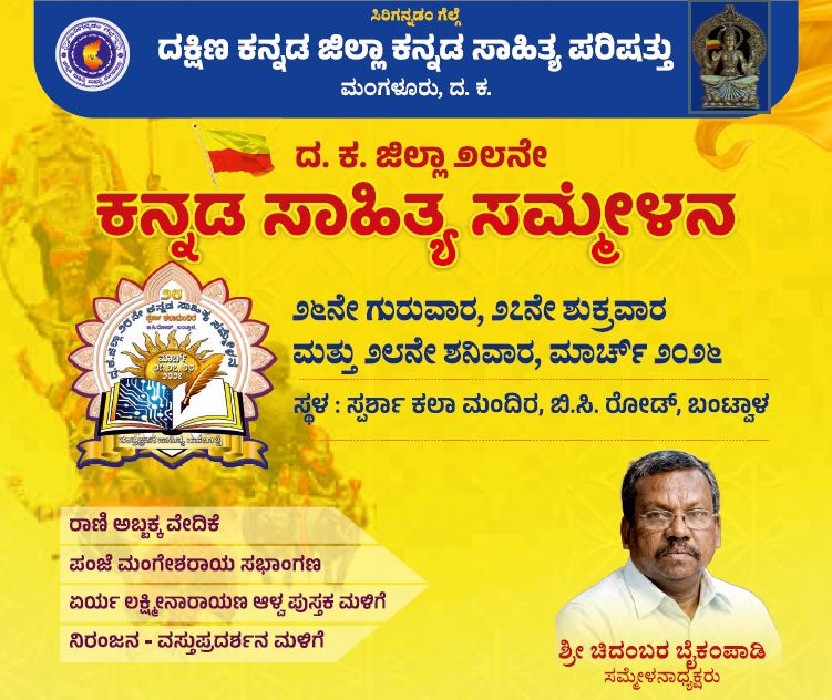 ತಂತ್ರಜ್ಞಾನ-ಸಾಹಿತ್ಯ-ಸಹಬಾಳ್ವೆ ಎಂಬ ಆಶಯದಲ್ಲಿ ರಾಣಿ ಅಬ್ಬಕ್ಕ ವೇದಿಕೆ, ಪಂಜೆ ಮಂಗೇಶರಾಯ ಸಭಾಂಗಣದಲ್ಲಿ ನಡೆಯಲಿರುವ ತ್ರಿದಿನ ಸಮ್ಮೇಳನದ ಸರ್ವಾಧ್ಯಕ್ಷತೆಯನ್ನು ಹಿರಿಯ ಪತ್ರಕರ್ತ ಹಾಗೂ ಸಾಹಿತಿ ಚಿದಂಬರ ಬೈಕಂಪಾಡಿ ವಹಿಸುವರು.