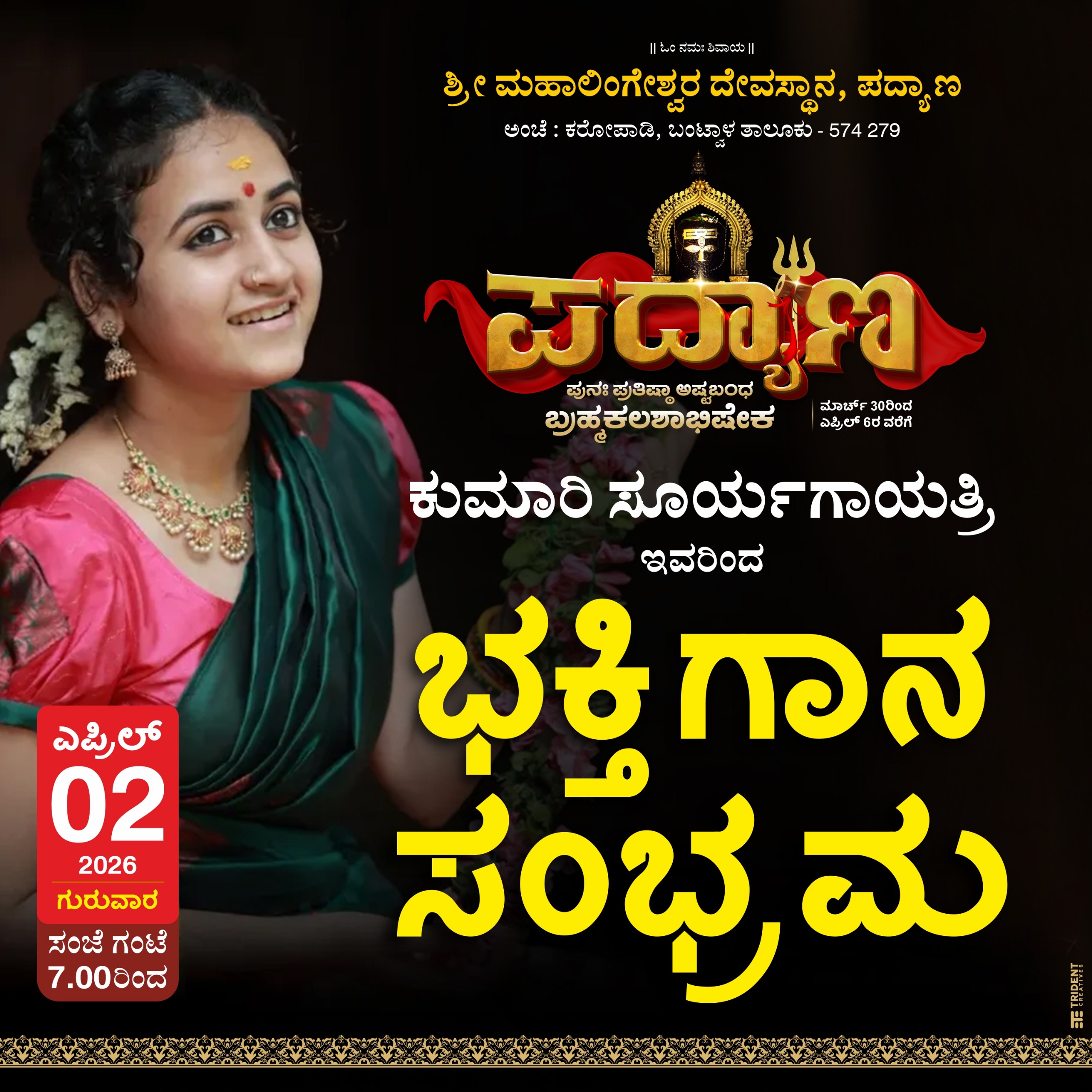 ಪದ್ಯಾಣ ಶ್ರೀ ಮಹಾಲಿಂಗೇಶ್ವರ ದೇವಸ್ಥಾನದಲ್ಲಿ ನಡೆಯುತ್ತಿರುವ ಬ್ರಹ್ಮಕಲಶೋತ್ಸವ ಕಾರ್ಯಕ್ರಮಗಳಲ್ಲಿ ಏಪ್ರಿಲ್ 2ರಂದು ನಡೆಯುವ ಕಾರ್ಯಕ್ರಮಗಳು ಇವು.