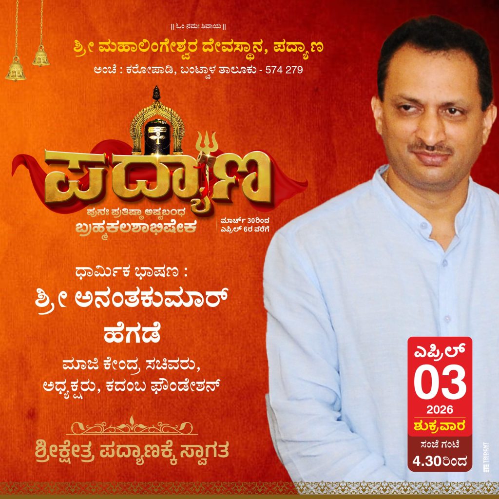 ಪದ್ಯಾಣ ಶ್ರೀ ಮಹಾಲಿಂಗೇಶ್ವರ ದೇವಸ್ಥಾನದಲ್ಲಿ ನಡೆಯುವ ಬ್ರಹ್ಮಕಲಶೋತ್ಸವ ಹಿನ್ನೆಲೆಯಲ್ಲಿ ಮಾ.30ರಿಂದ ಹಲವು ಧಾರ್ಮಿಕ, ಸಾಂಸ್ಕೃತಿಕ ಕಾರ್ಯಕ್ರಮಗಳು ನಡೆಯುತ್ತಿದ್ದು, ಏ.3ರ ಸಂಜೆ 4.30ಕ್ಕೆ ಕೇಂದ್ರ ಮಾಜಿ ಸಚಿವ ಹಾಗೂ ಕದಂಬ ಫೌಂಡೇಶನ್ ಸಂಸ್ಥಾಪಕ ಅನಂತ ಕುಮಾರ ಹೆಗಡೆ ಆಗಮಿಸಲಿದ್ದಾರೆ. ಈ ಹೊತ್ತಿನಲ್ಲಿ ನಡೆಯುವ ಸುಧರ್ಮ ಸಭೆಯಲ್ಲಿ ಅವರು ಧಾರ್ಮಿಕ ಭಾಷಣ ಮಾಡಲಿದ್ದಾರೆ