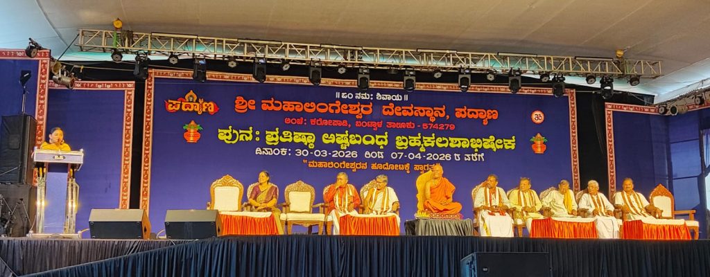 ಪದ್ಯಾಣ ಶ್ರೀ ಮಹಾಲಿಂಗೇಶ್ವರ ದೇವಸ್ಥಾನದಲ್ಲಿ ನಡೆಯುತ್ತಿರುವ ಬ್ರಹ್ಮಕಲಶೋತ್ಸವ ಸಮಾರಂಭದ ಧಾರ್ಮಿಕ ಸಭೆಯಲ್ಲಿ ಮಾತನಾಡಿದರು